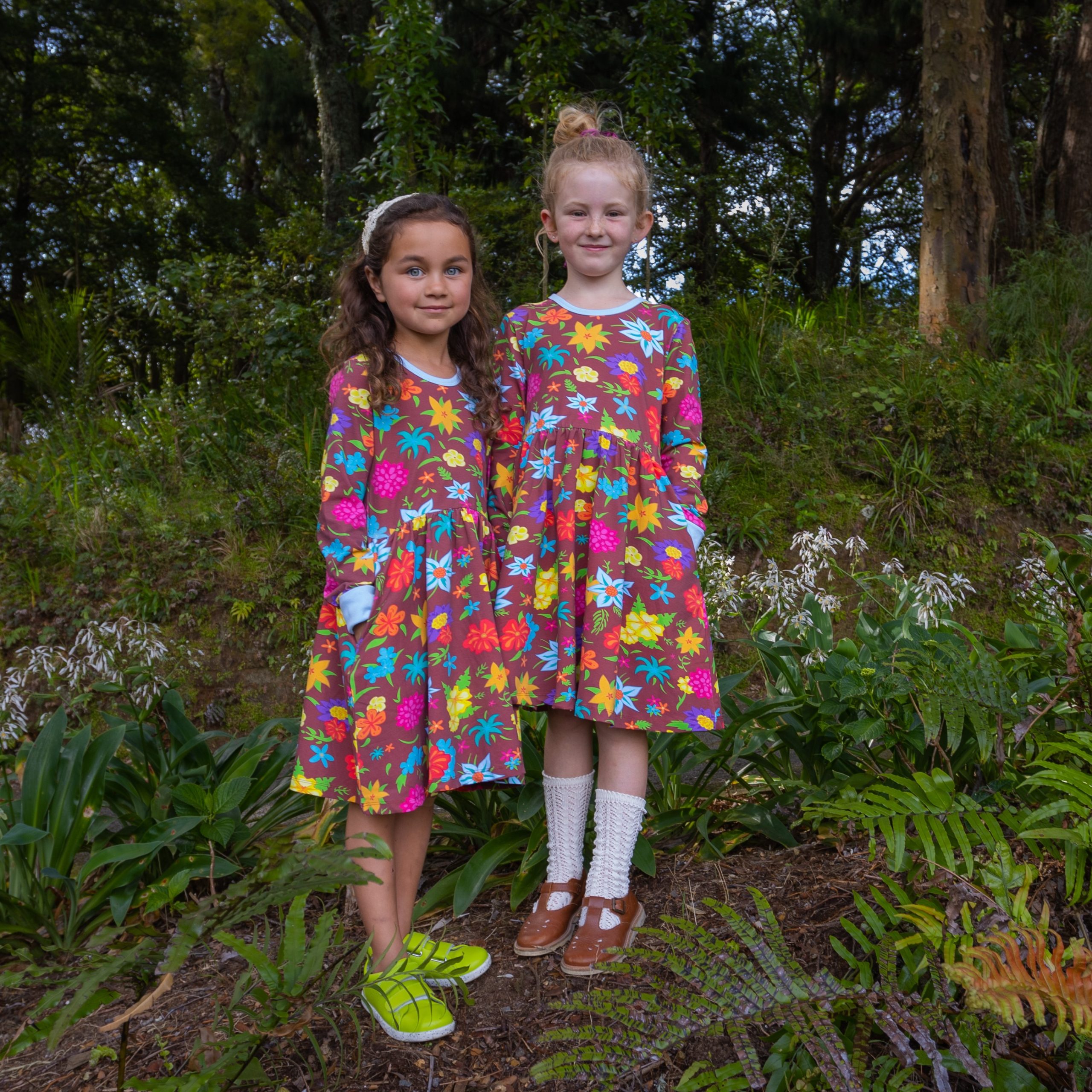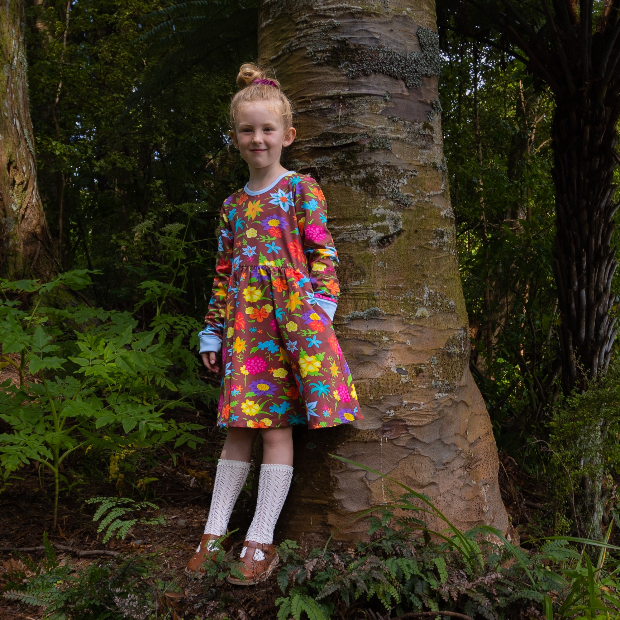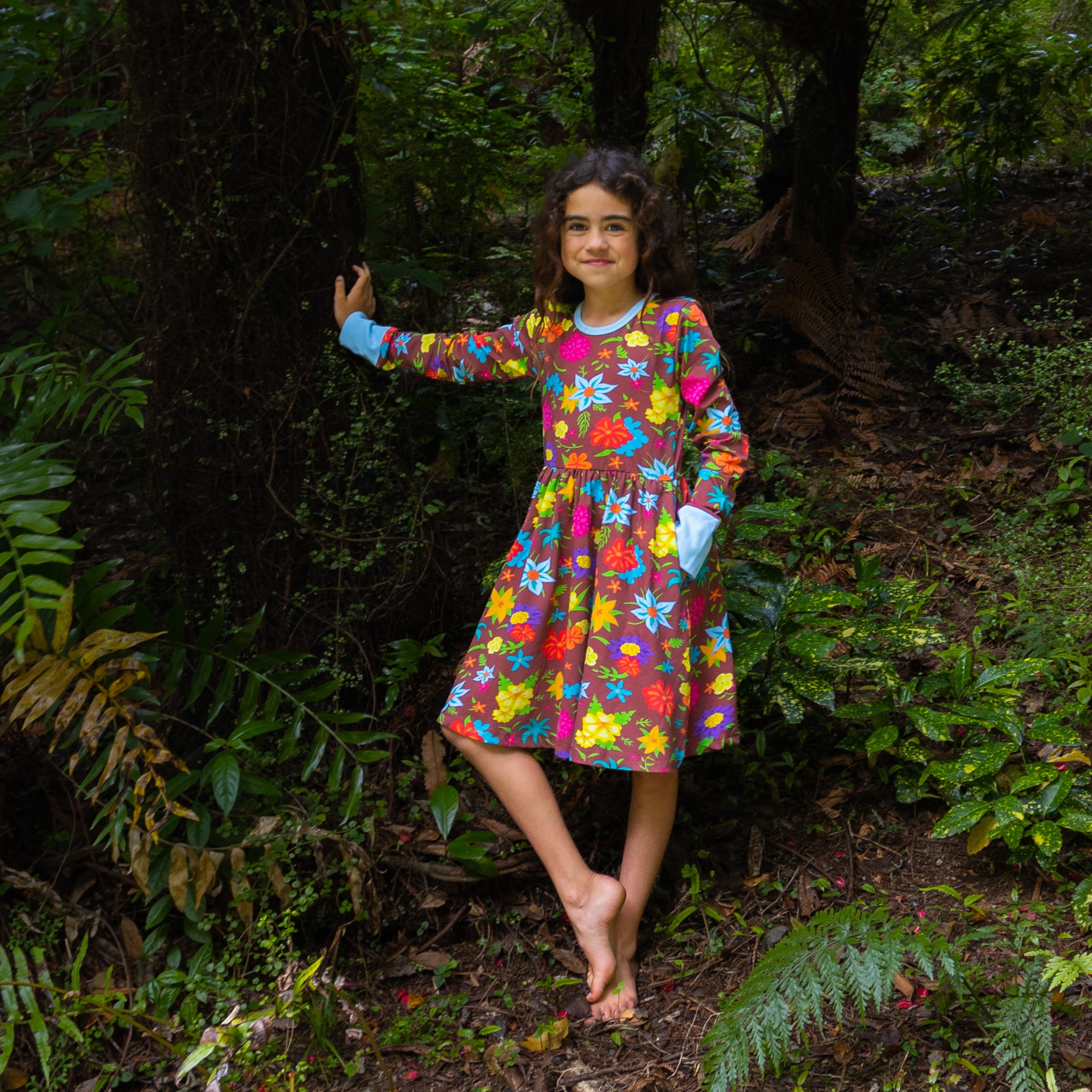This rich brown long sleeved dress is full of brightly coloured flowers in all the colours of the rainbow. It’s completed by pale blue binding at the neck and thick matching ribbing at the cuffs, the cuffs can be folded back or left unfolded so they allow for room to grow. It even has pockets for collecting treasures!