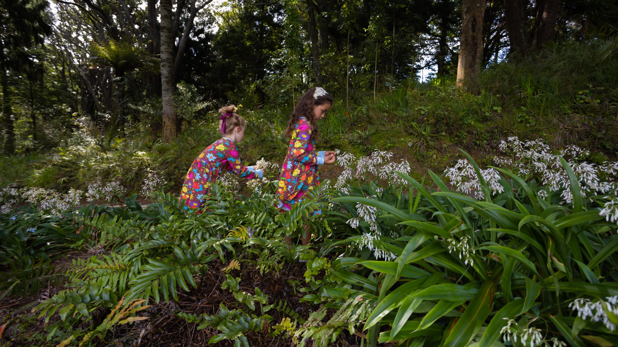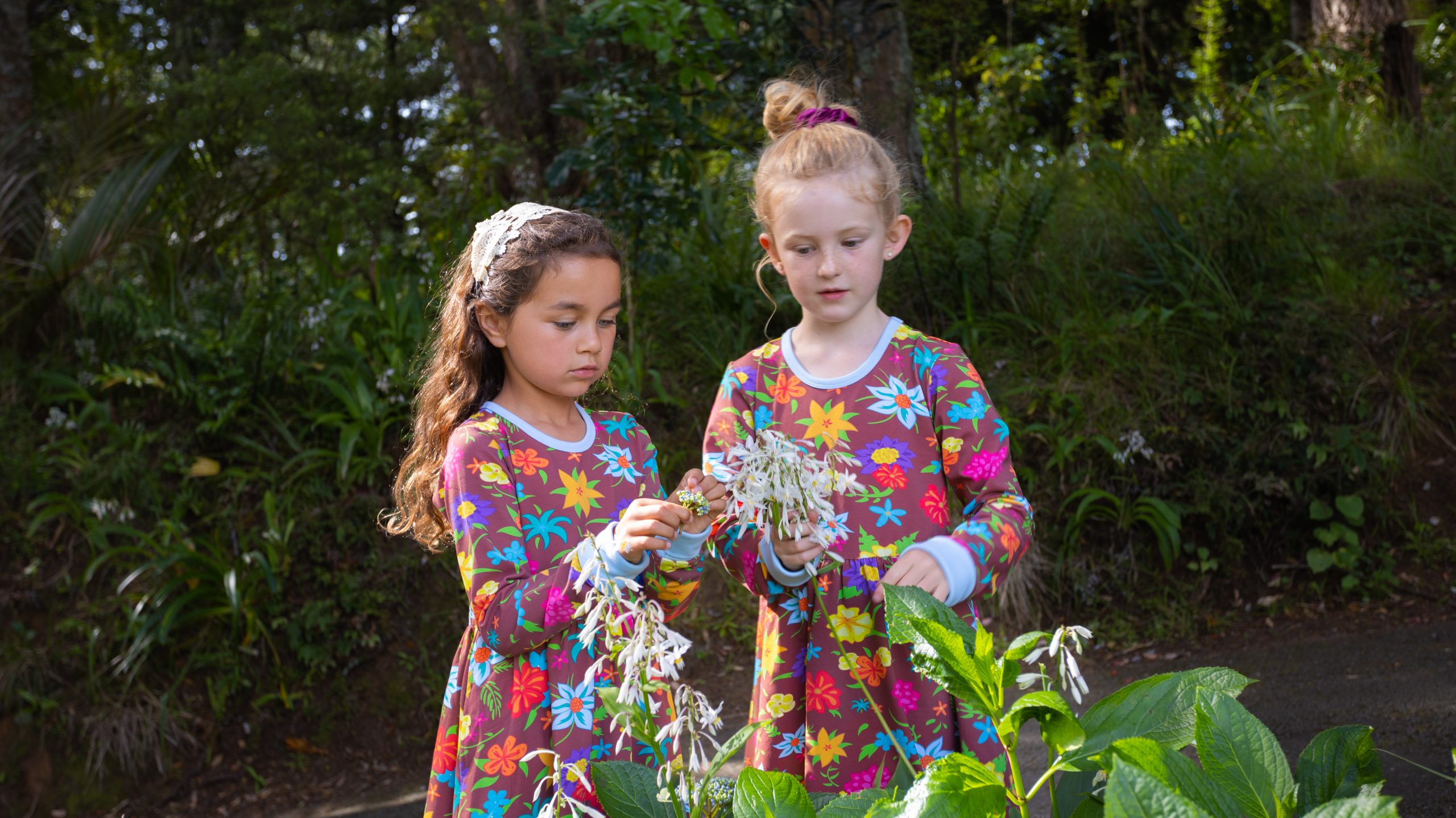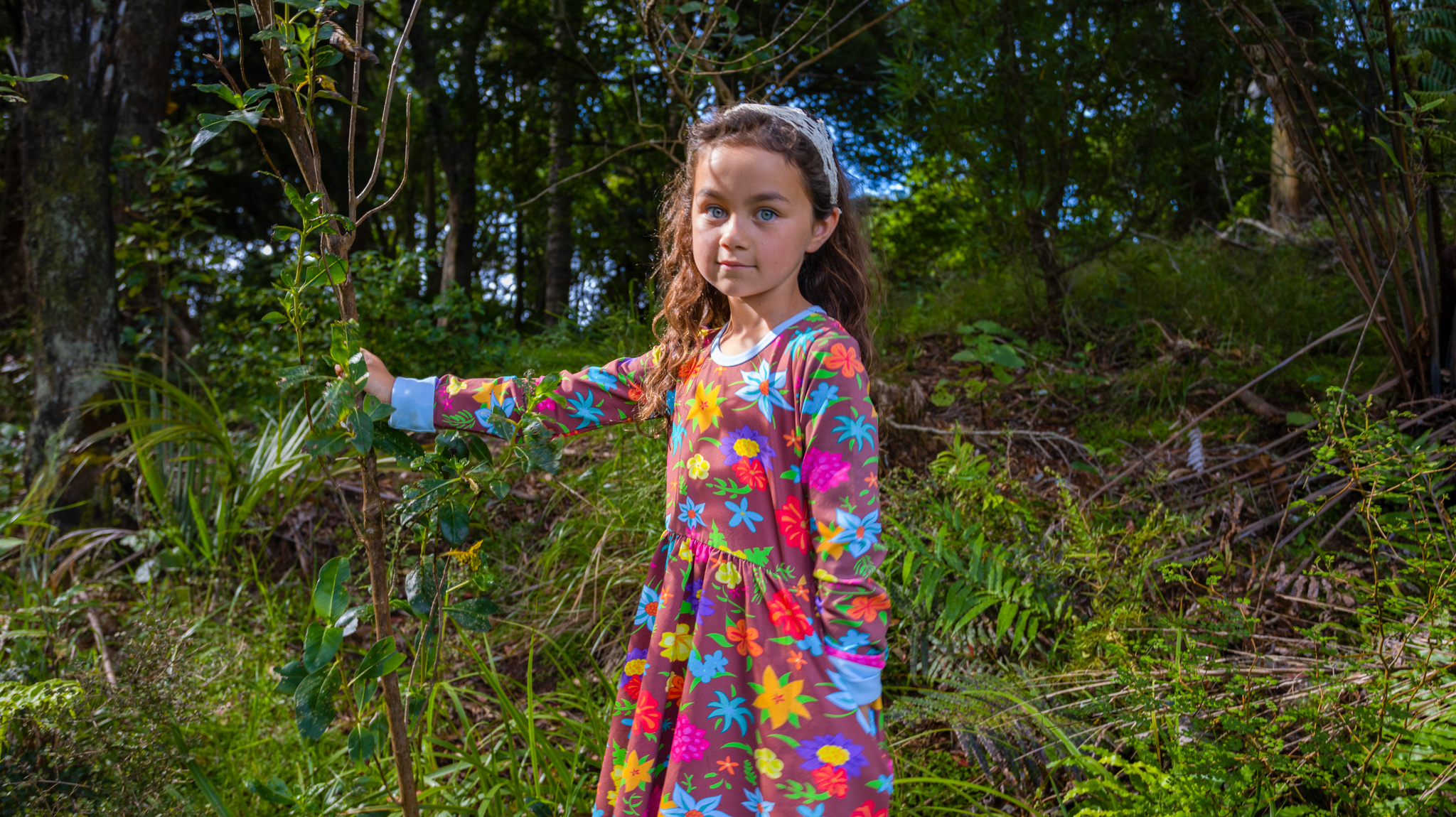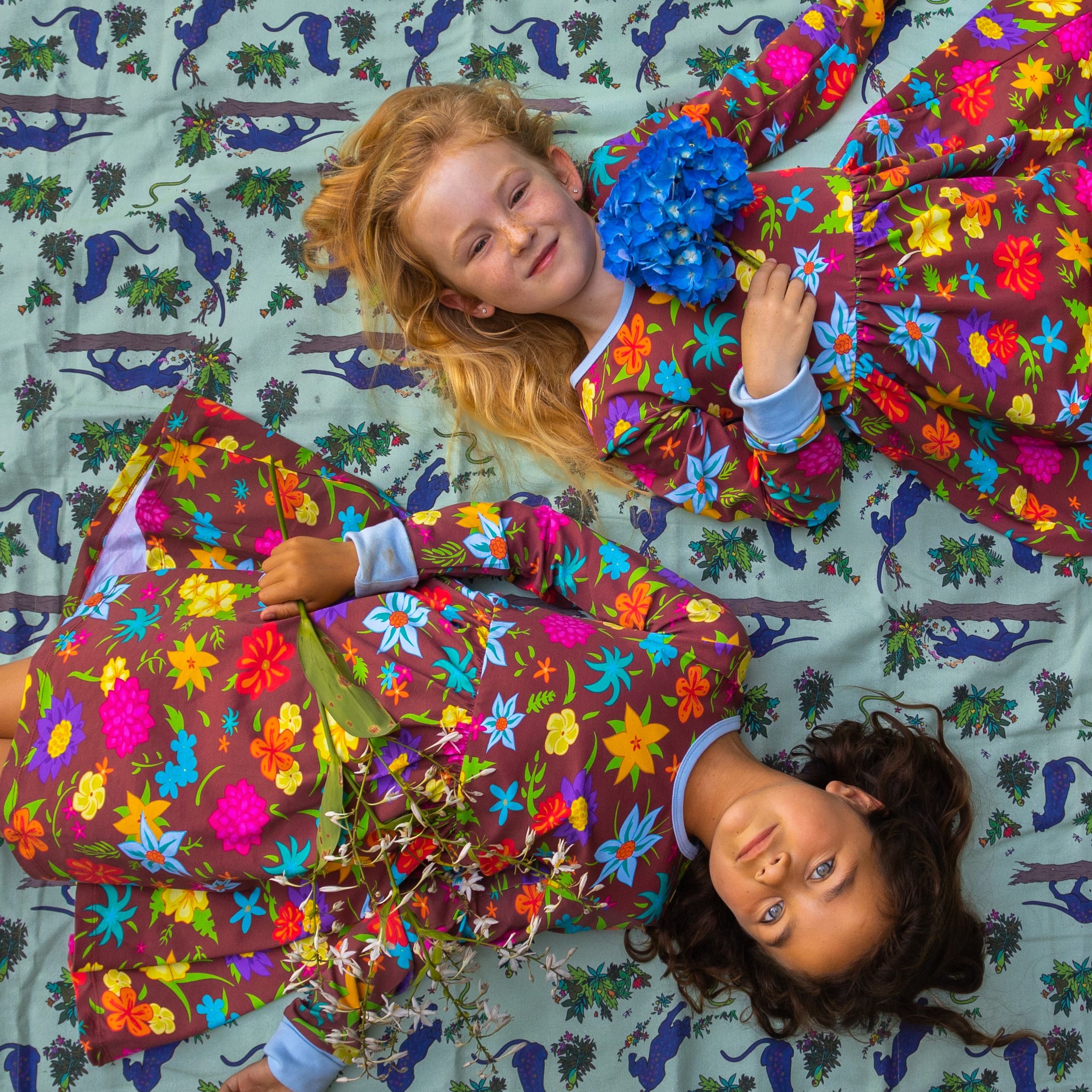 This rich brown long sleeved dress is full of brightly coloured flowers in all the colours of the rainbow. It’s completed by pale blue binding at the neck and thick matching ribbing at the cuffs, the cuffs can be folded back or left unfolded so they allow for room to grow. It even has pockets for collecting treasures!