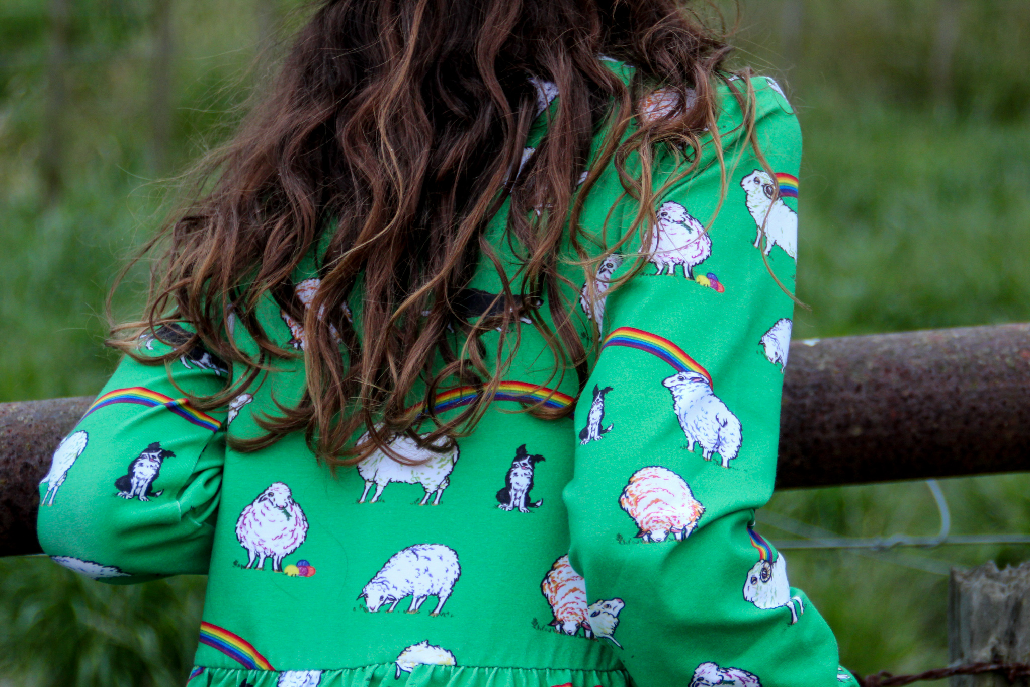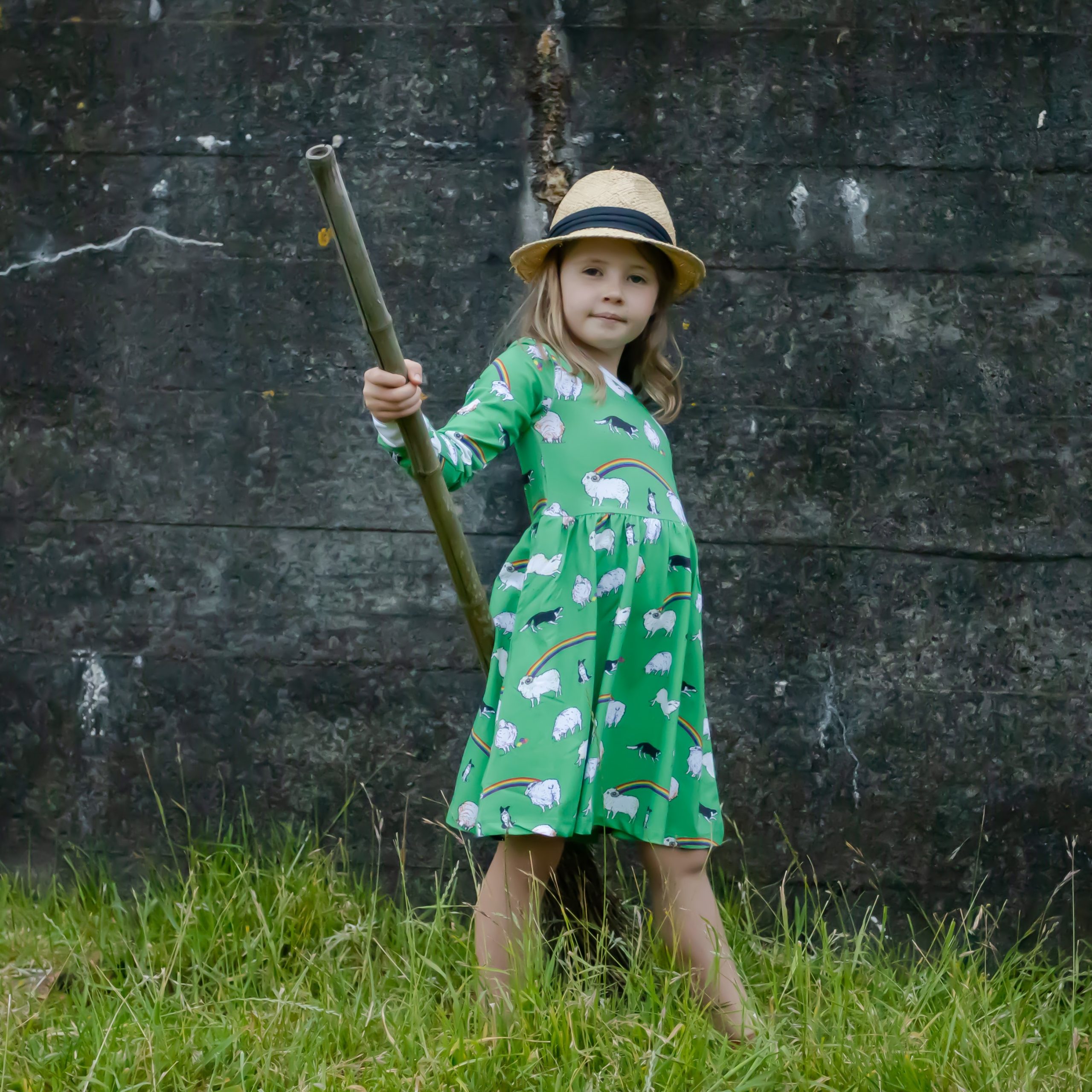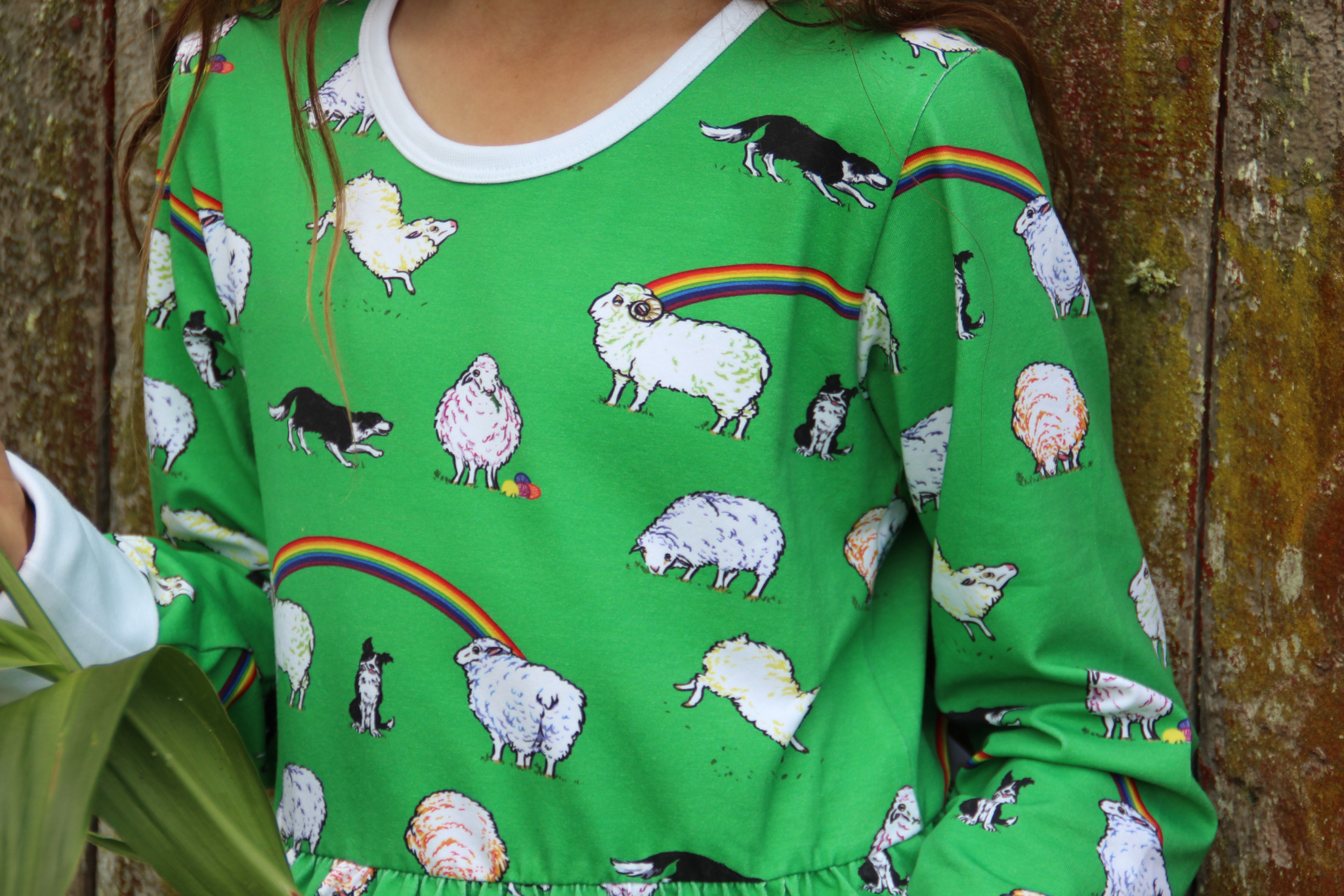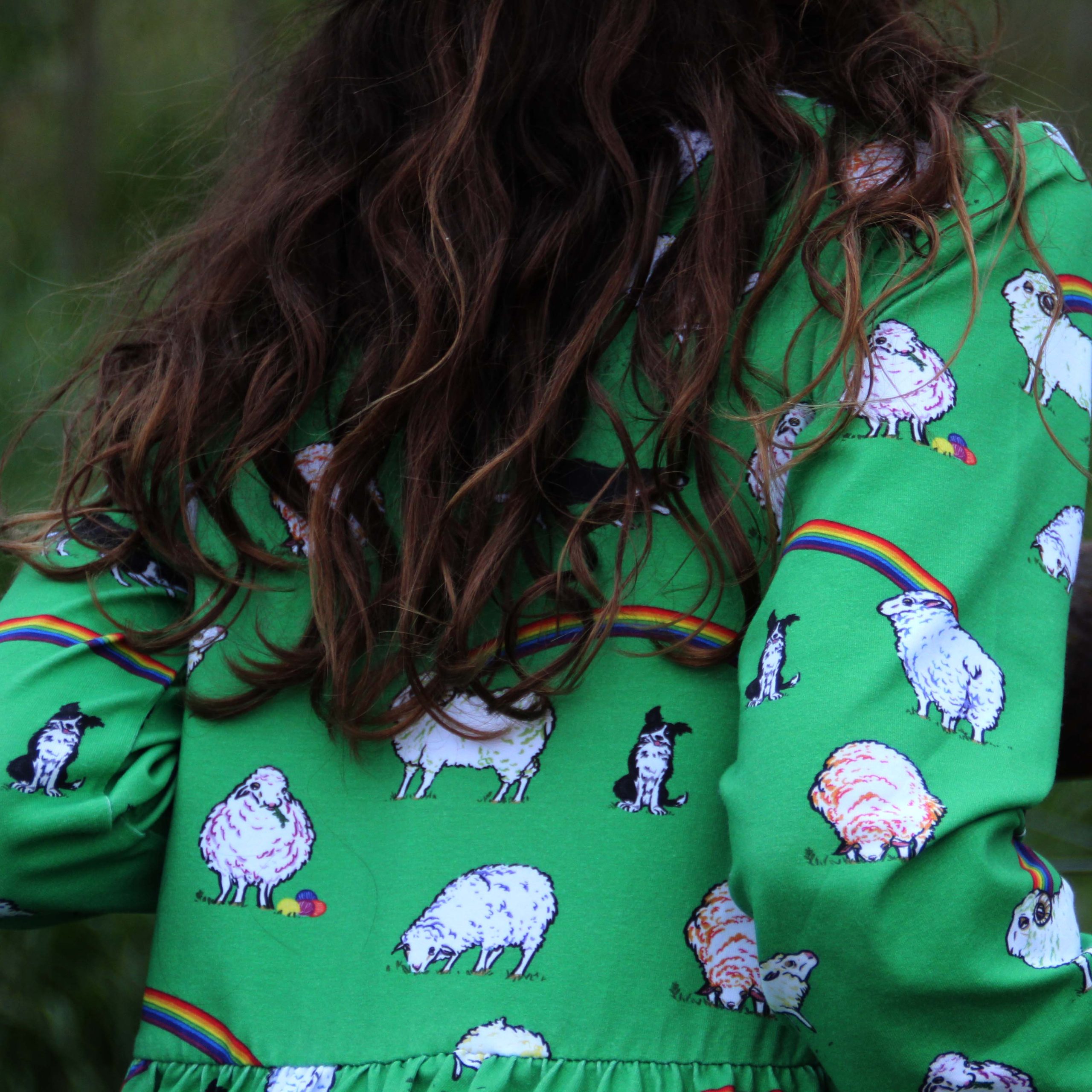 This stunning long sleeved dress in grass green features sheep with hints of rainbow colours and black and white sheep dogs amongst rainbows. It has pockets and beautiful white binding at the neck and matching thick ribbing at the cuffs which can be folded back or left unfolded to allow room to grow.