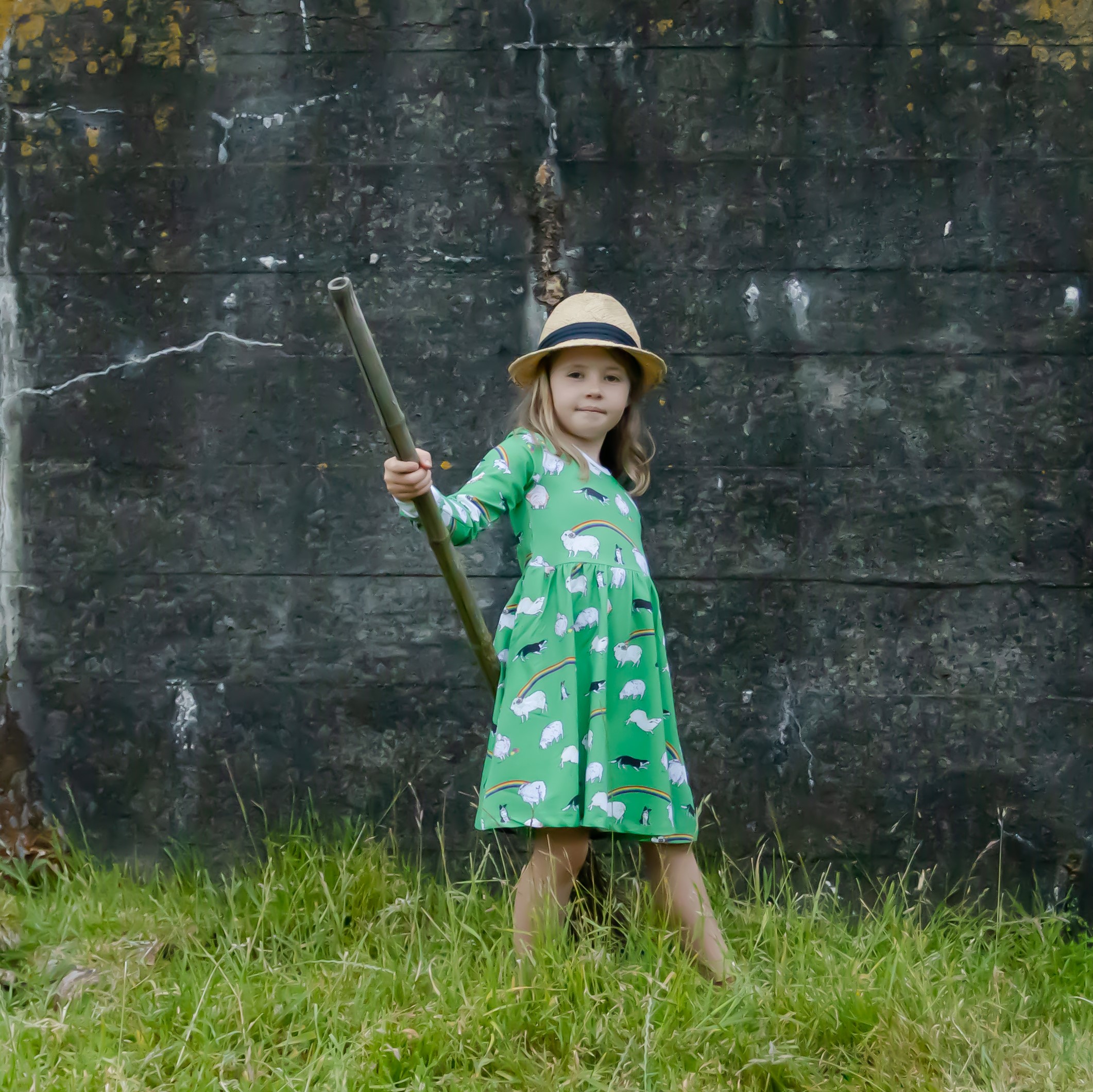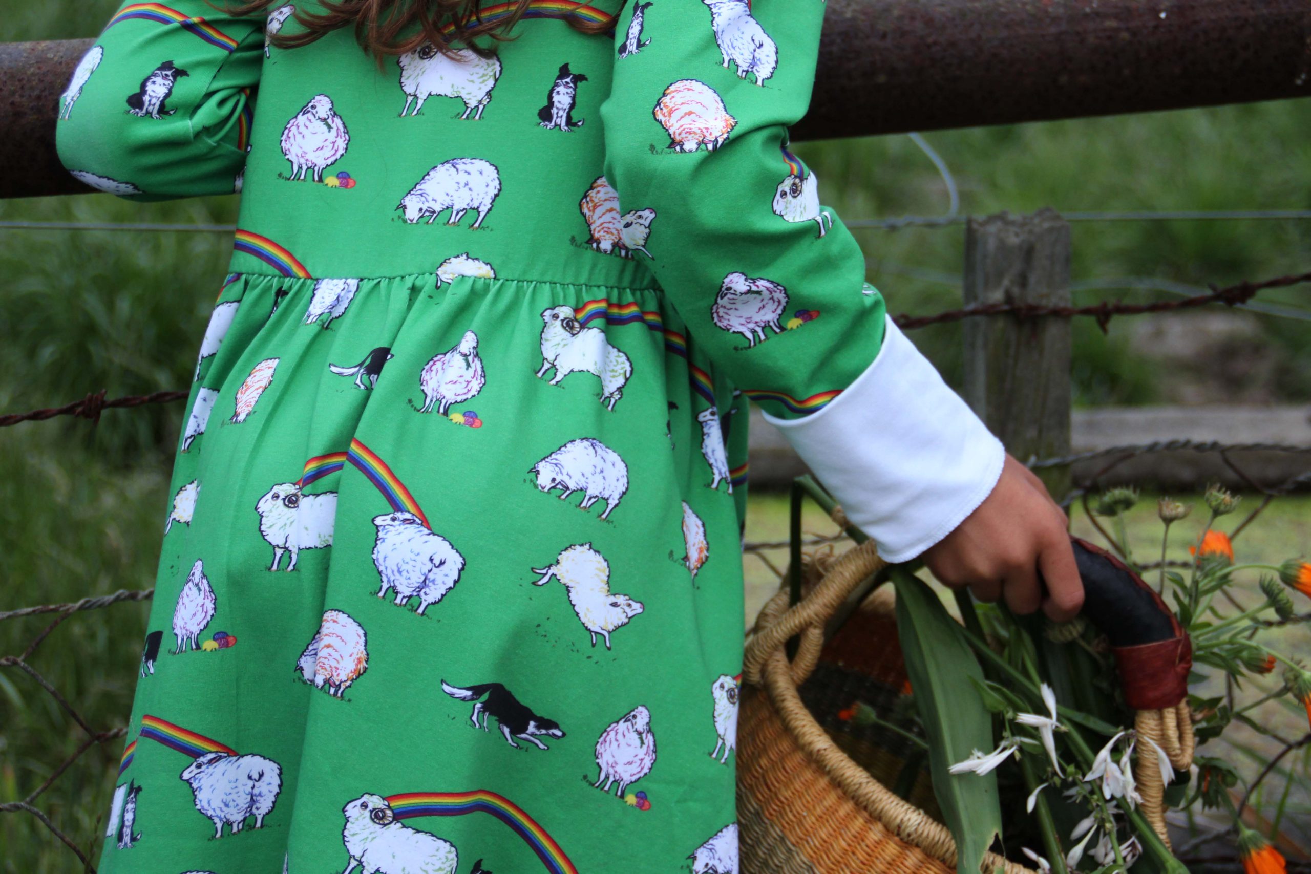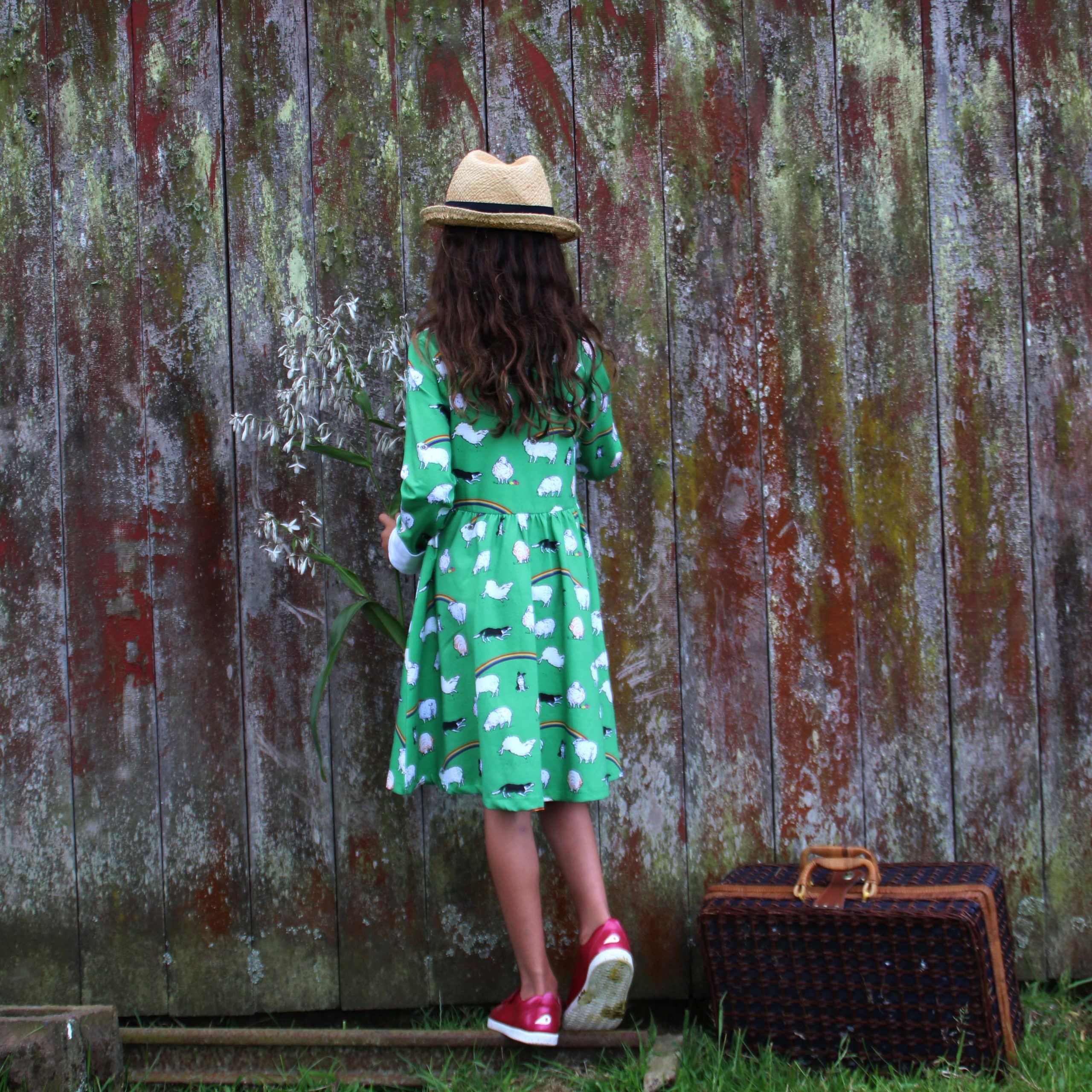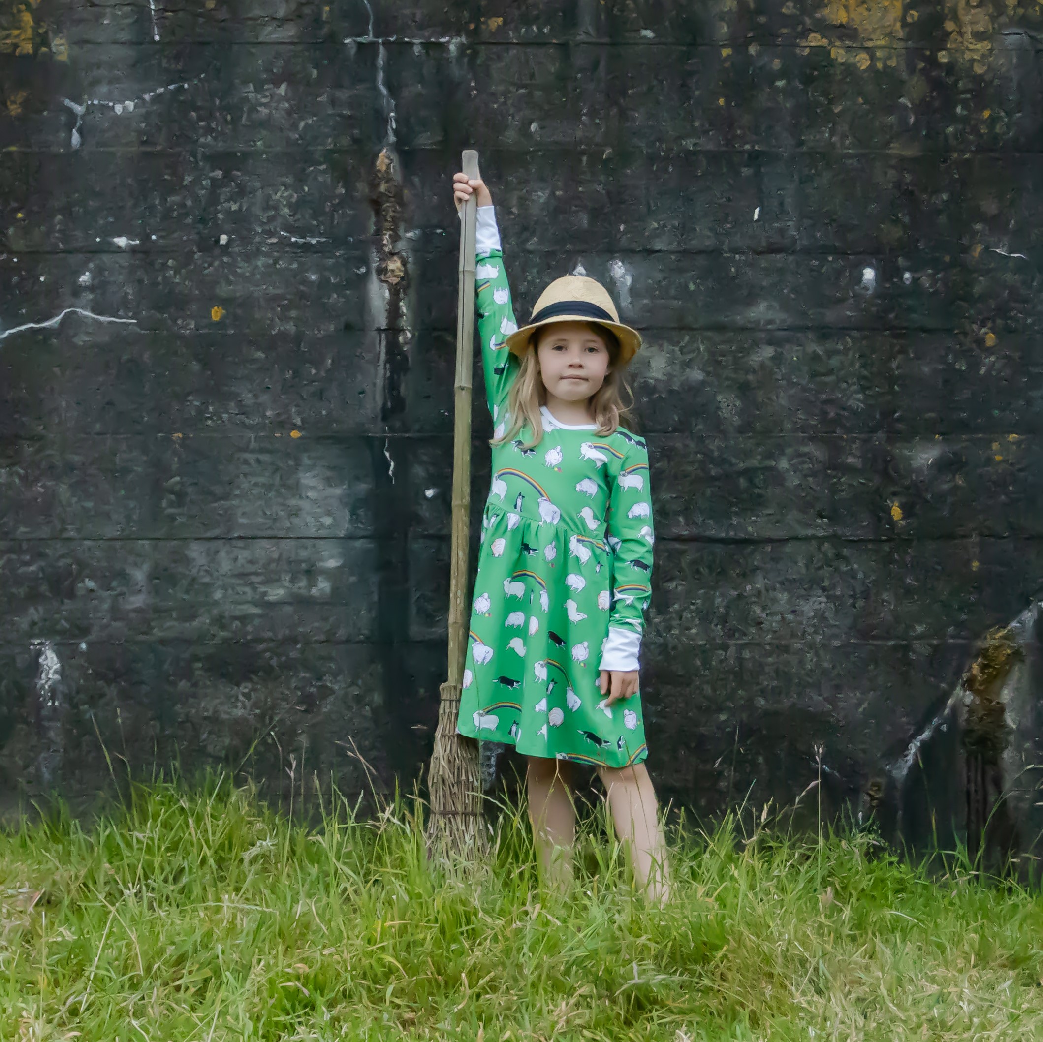 This stunning long sleeved dress in grass green features sheep with hints of rainbow colours and black and white sheep dogs amongst rainbows. It has pockets and beautiful white binding at the neck and matching thick ribbing at the cuffs which can be folded back or left unfolded to allow room to grow.
