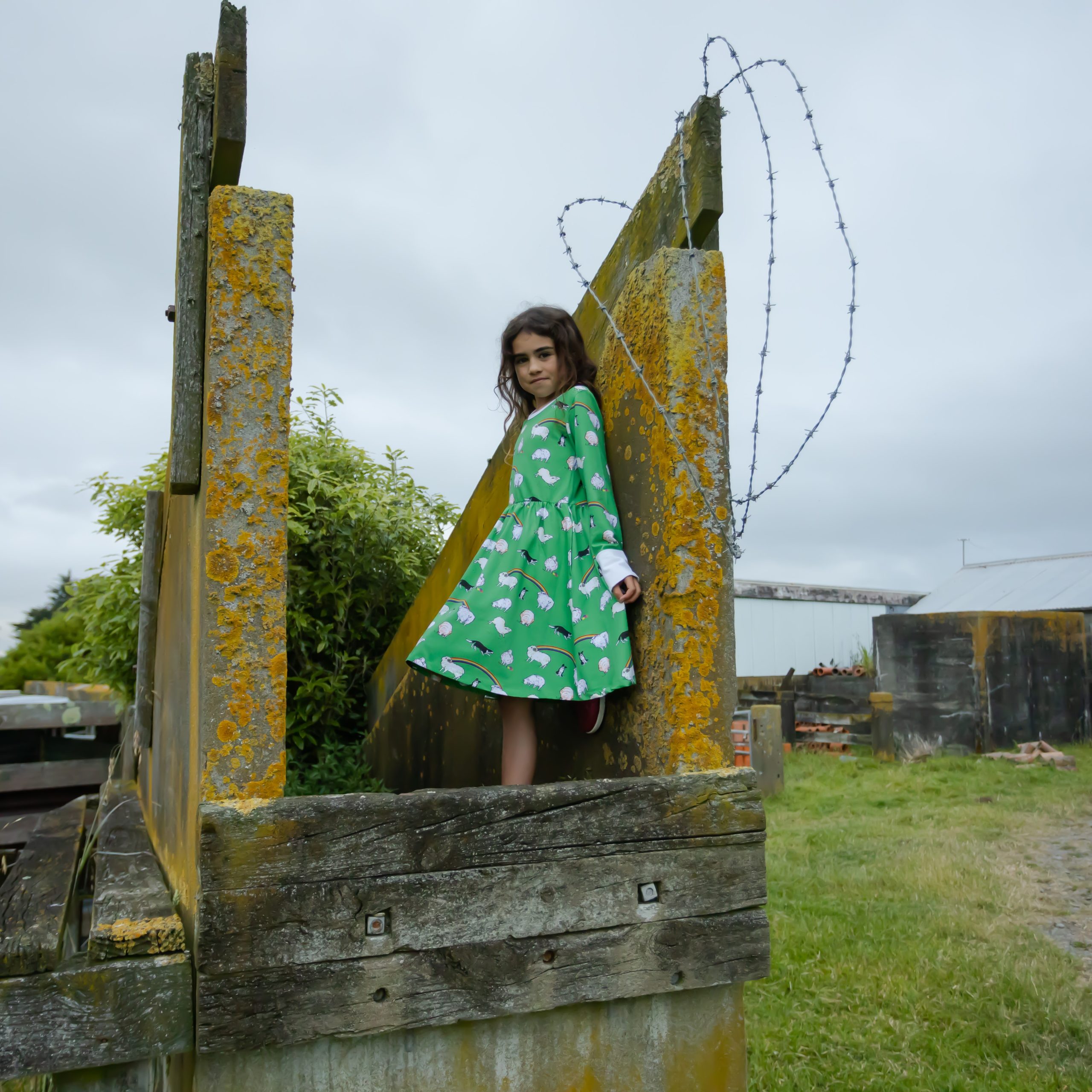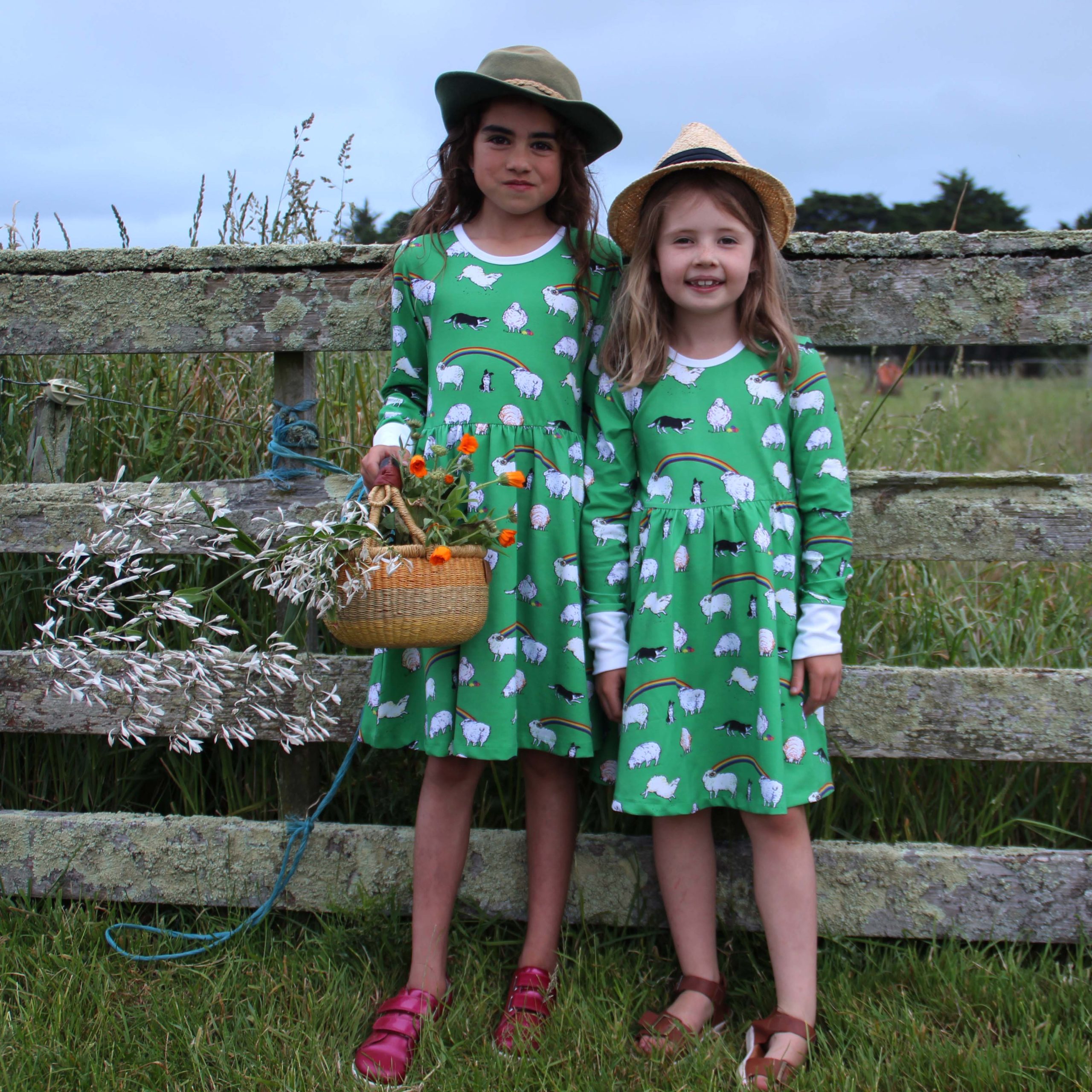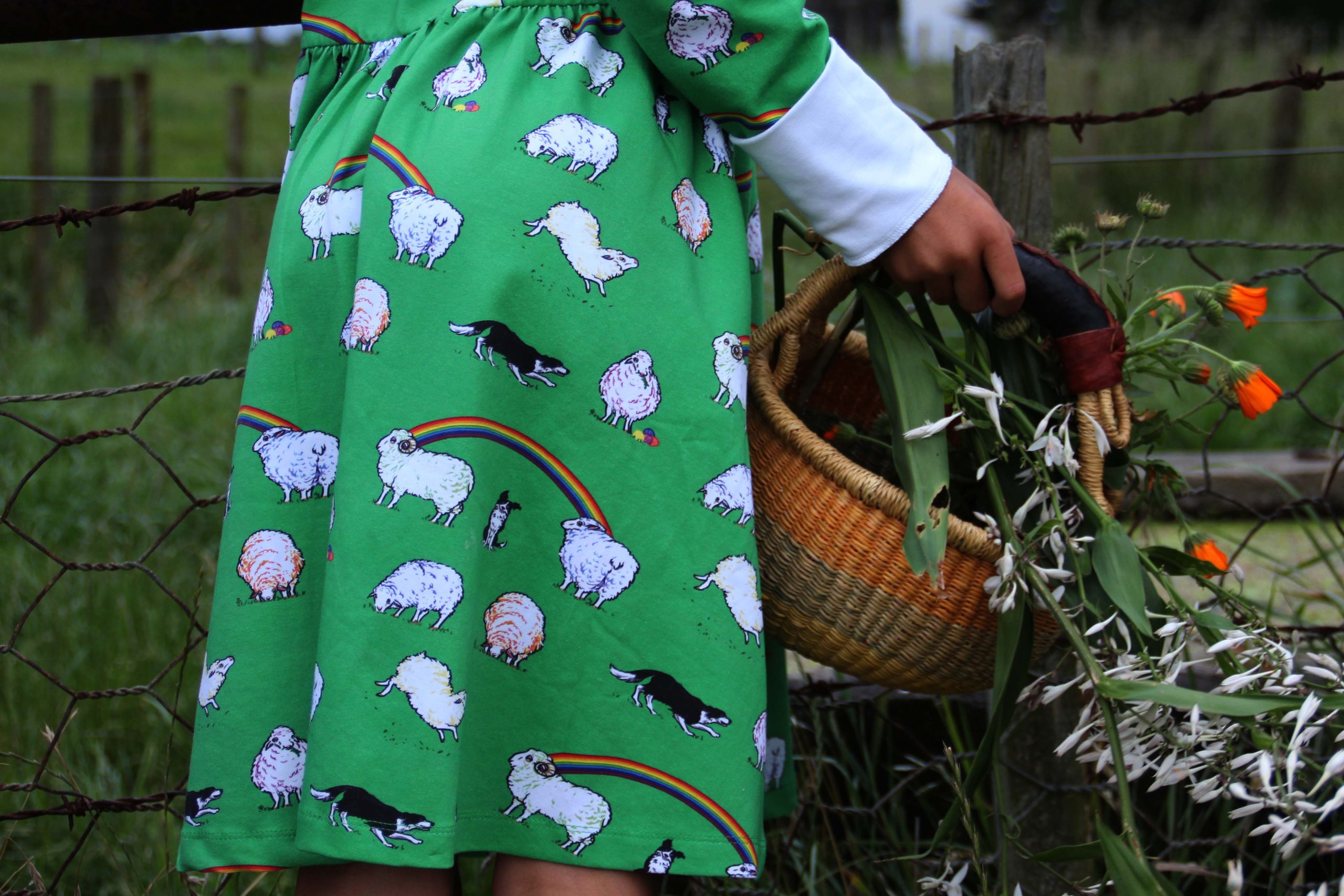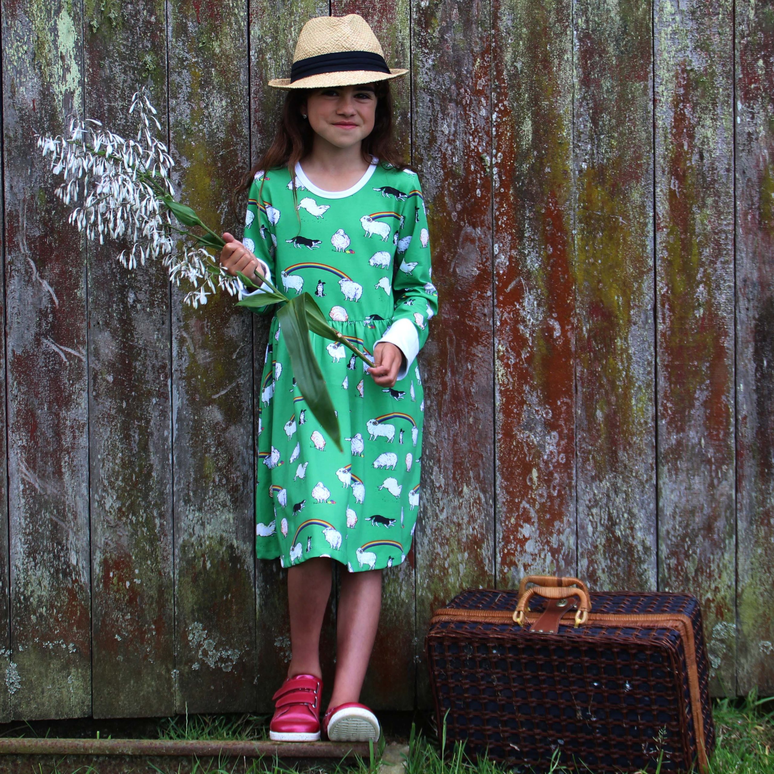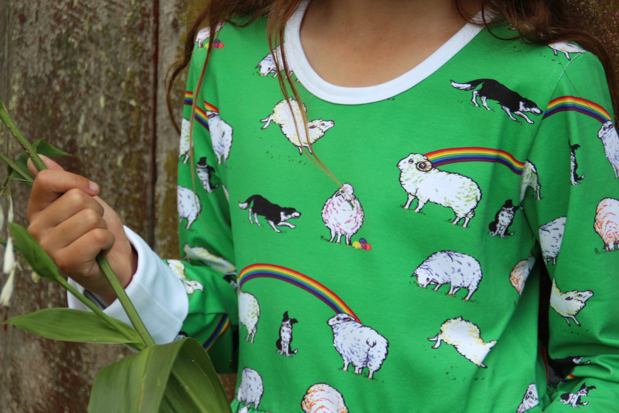 This stunning long sleeved dress in grass green features sheep with hints of rainbow colours and black and white sheep dogs amongst rainbows. It has pockets and beautiful white binding at the neck and matching thick ribbing at the cuffs which can be folded back or left unfolded to allow room to grow.