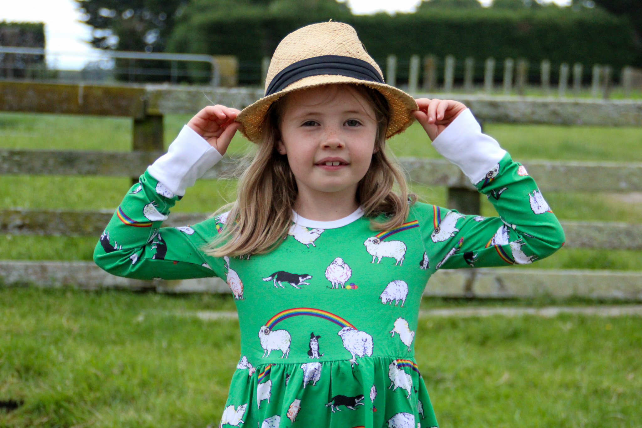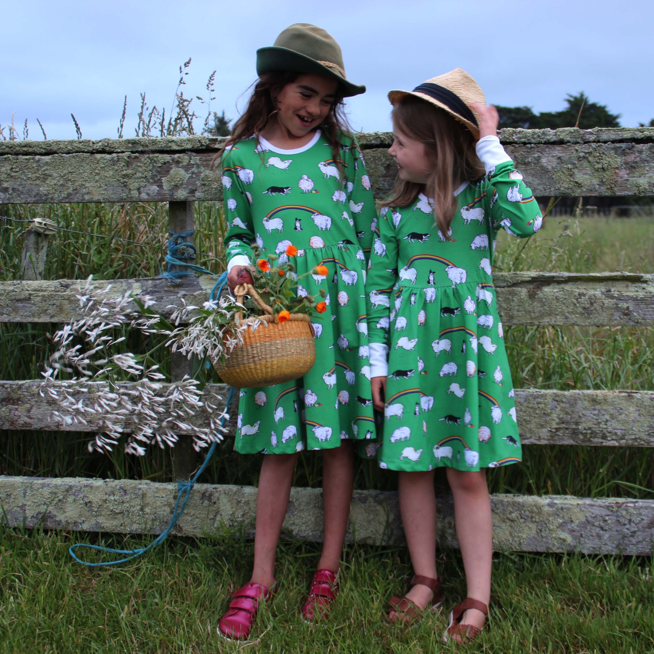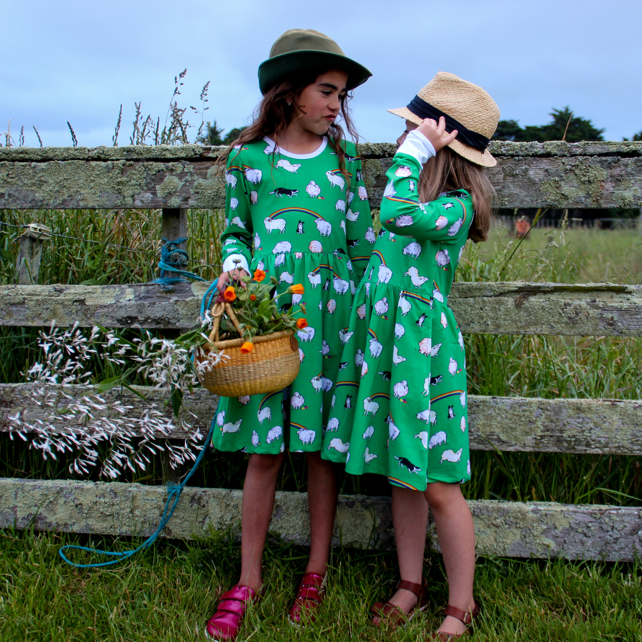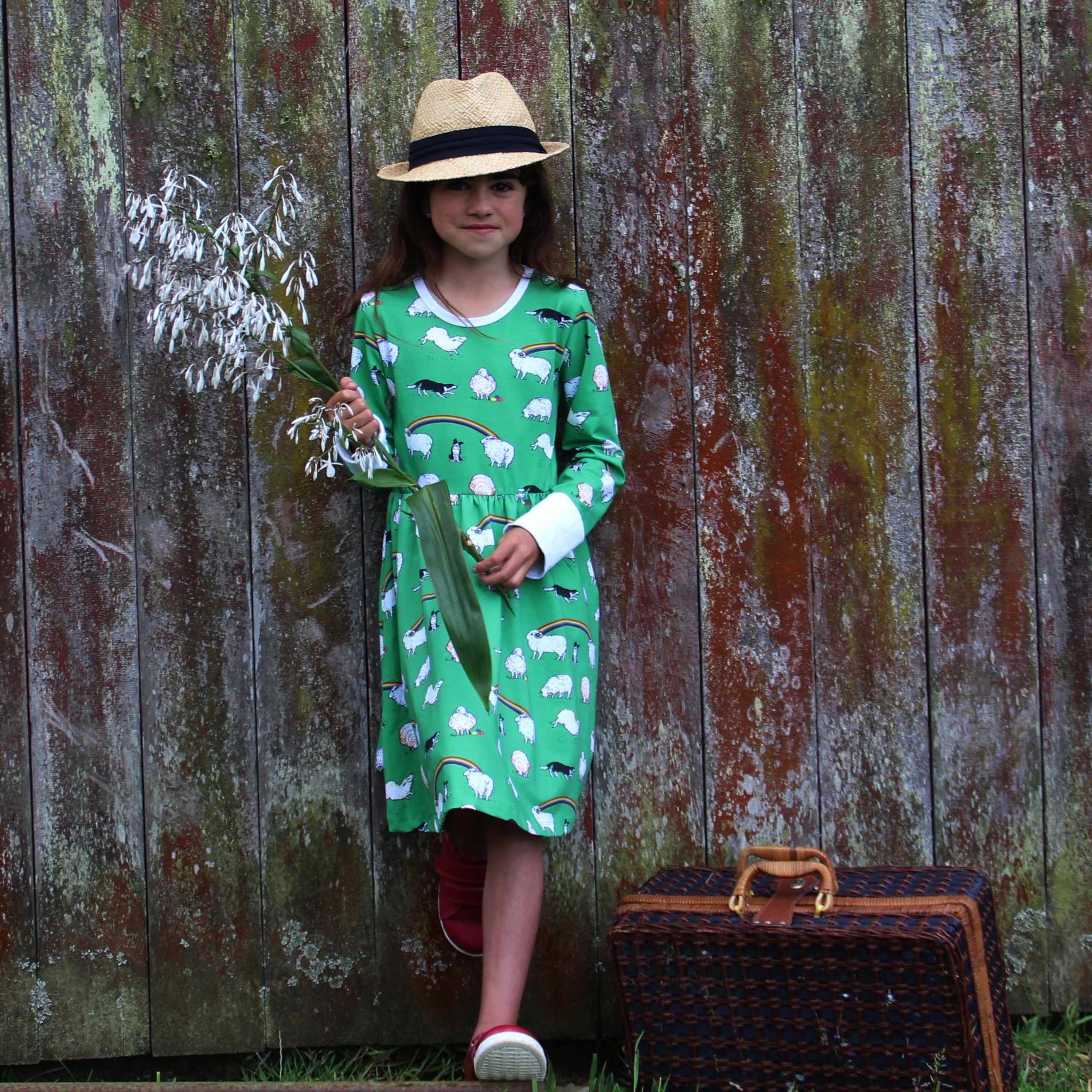 This stunning long sleeved dress in grass green features sheep with hints of rainbow colours and black and white sheep dogs amongst rainbows. It has pockets and beautiful white binding at the neck and matching thick ribbing at the cuffs which can be folded back or left unfolded to allow room to grow.