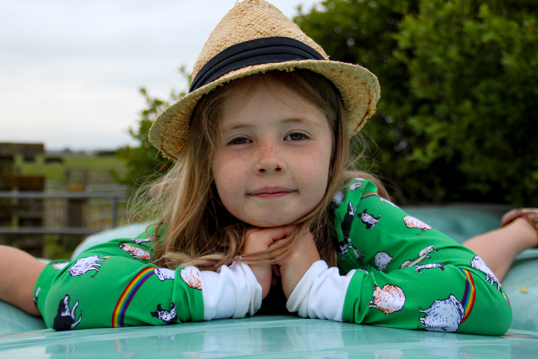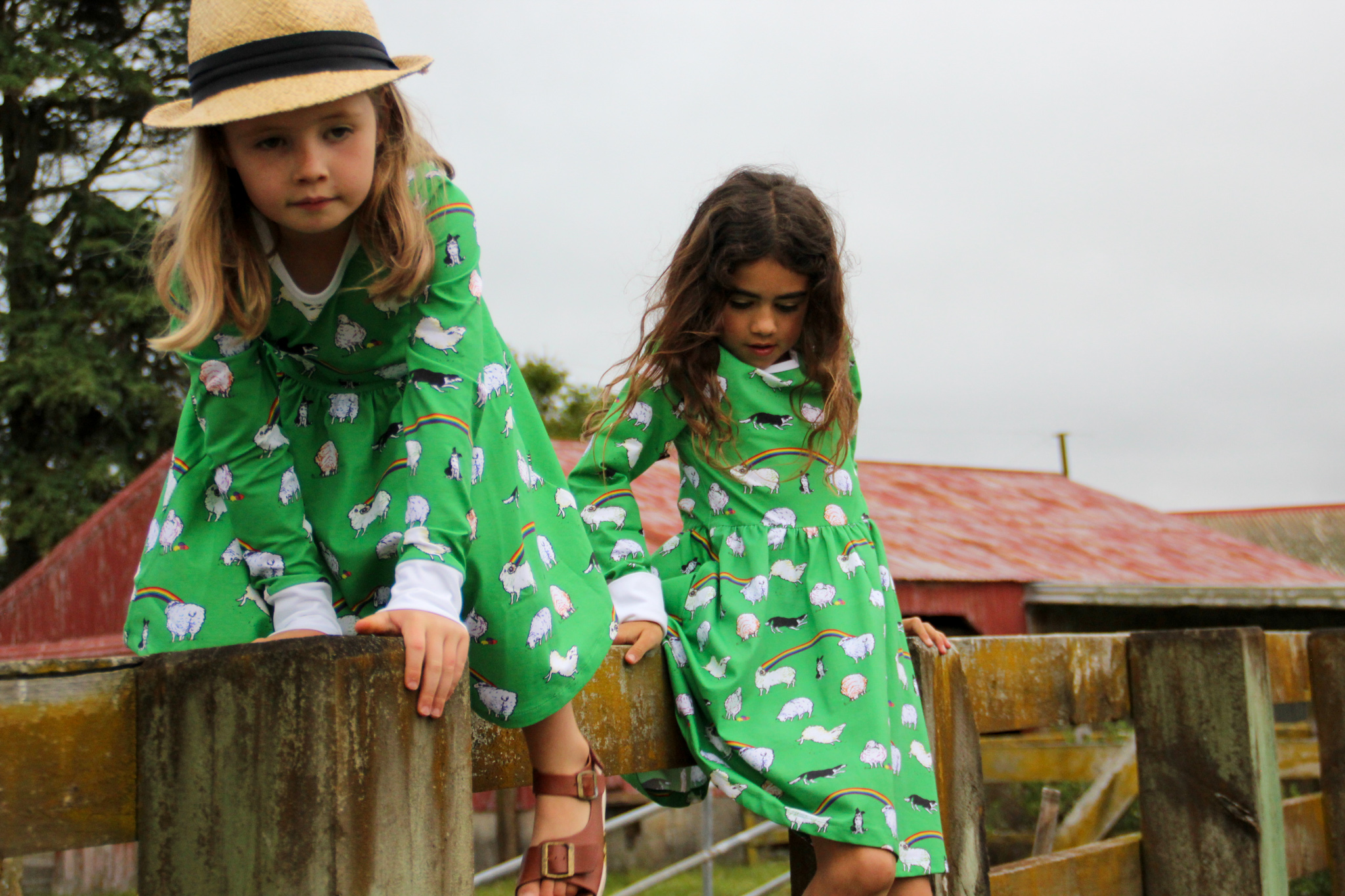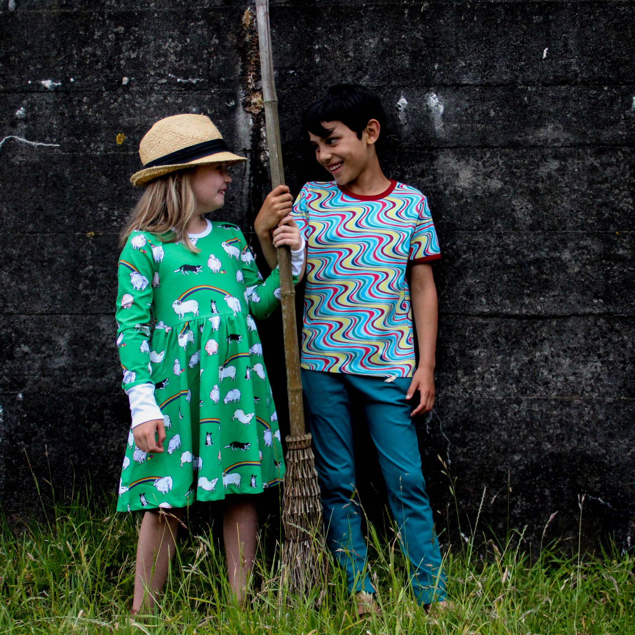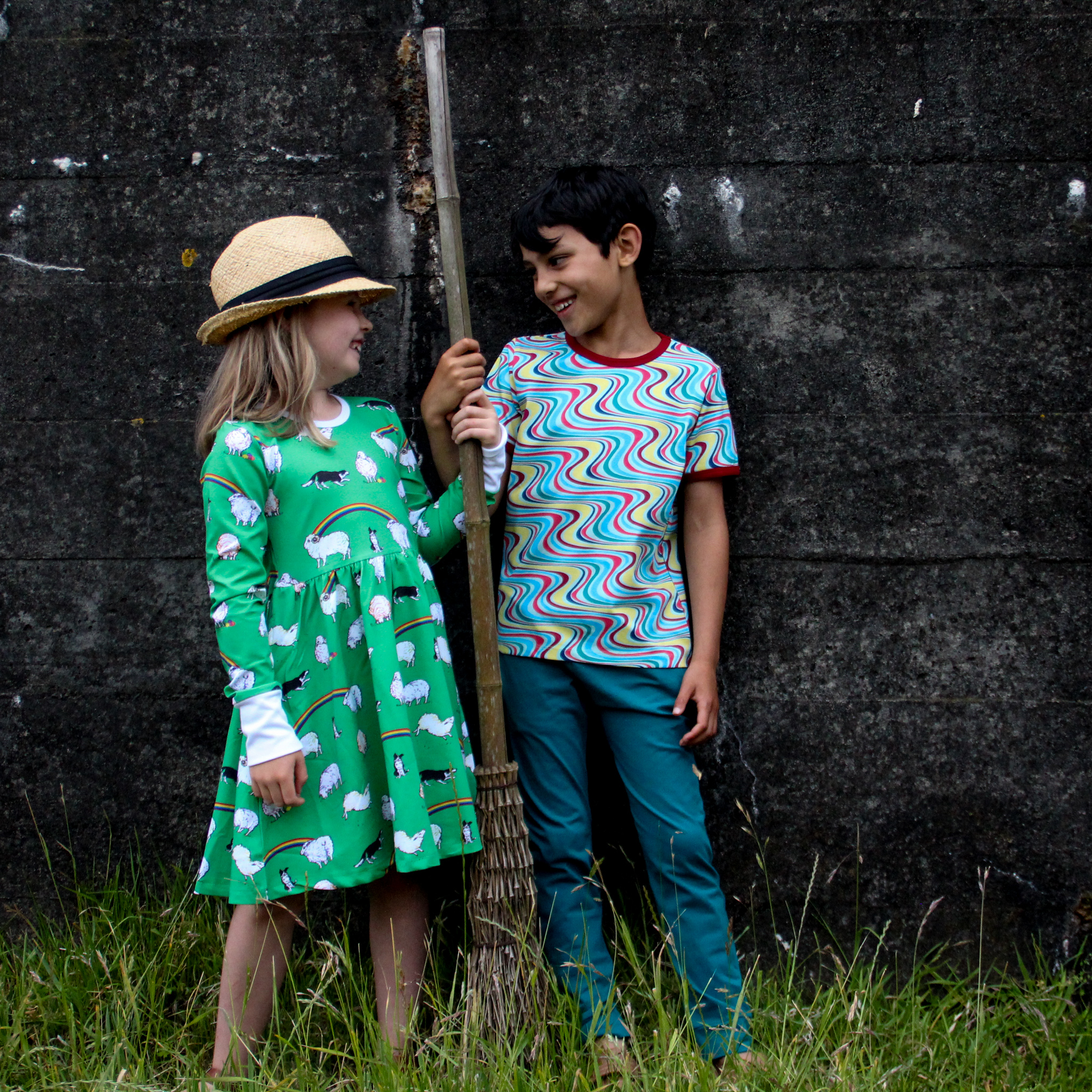 This stunning long sleeved dress in grass green features sheep with hints of rainbow colours and black and white sheep dogs amongst rainbows. It has pockets and beautiful white binding at the neck and matching thick ribbing at the cuffs which can be folded back or left unfolded to allow room to grow.