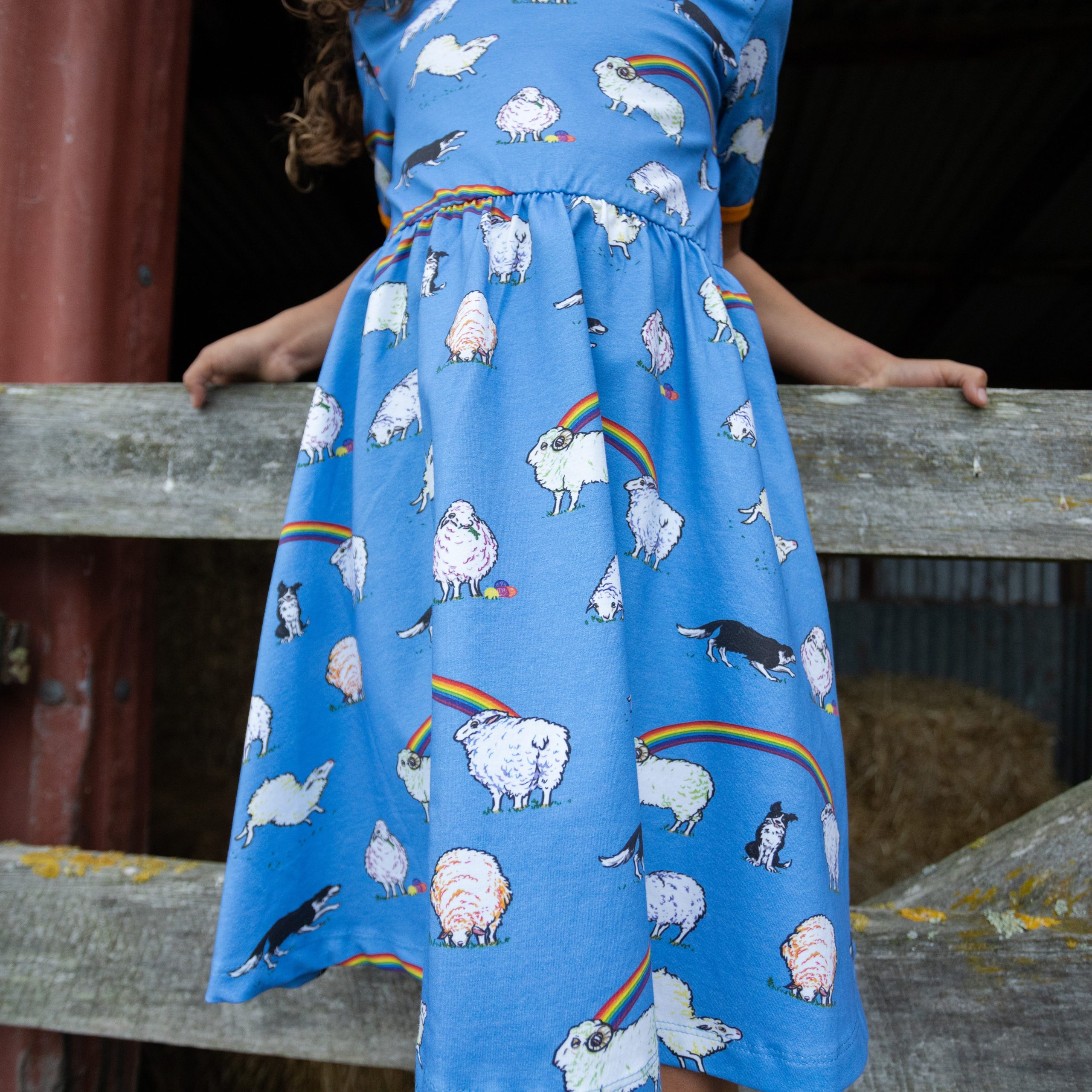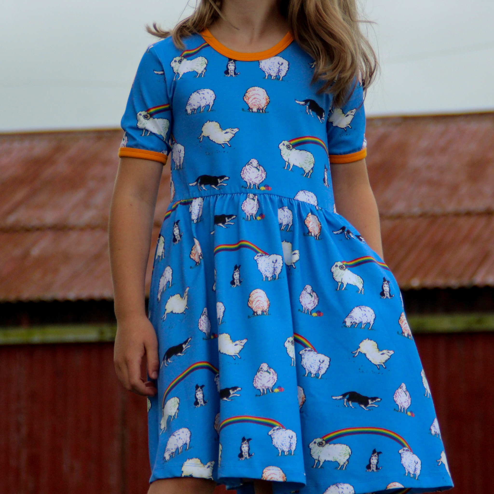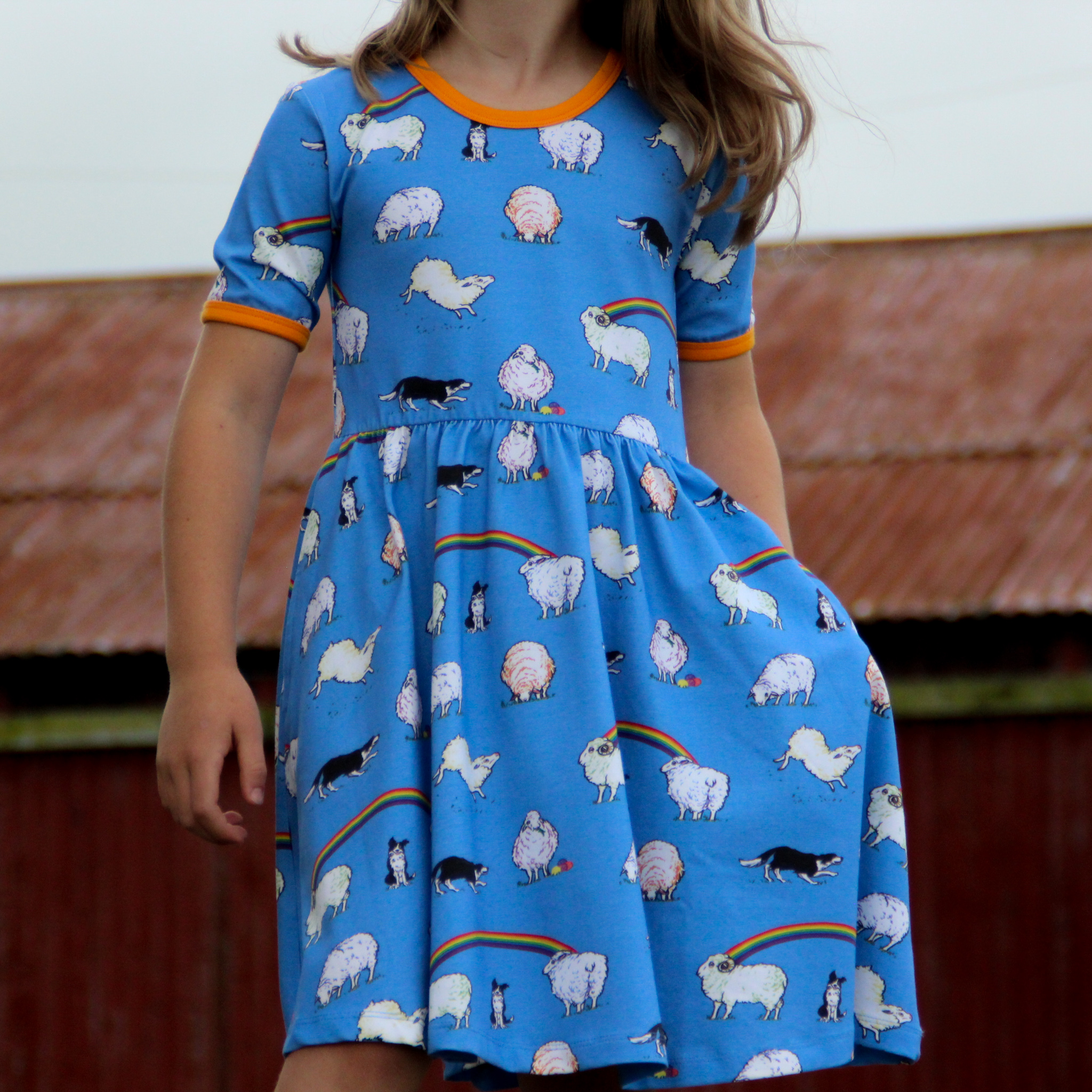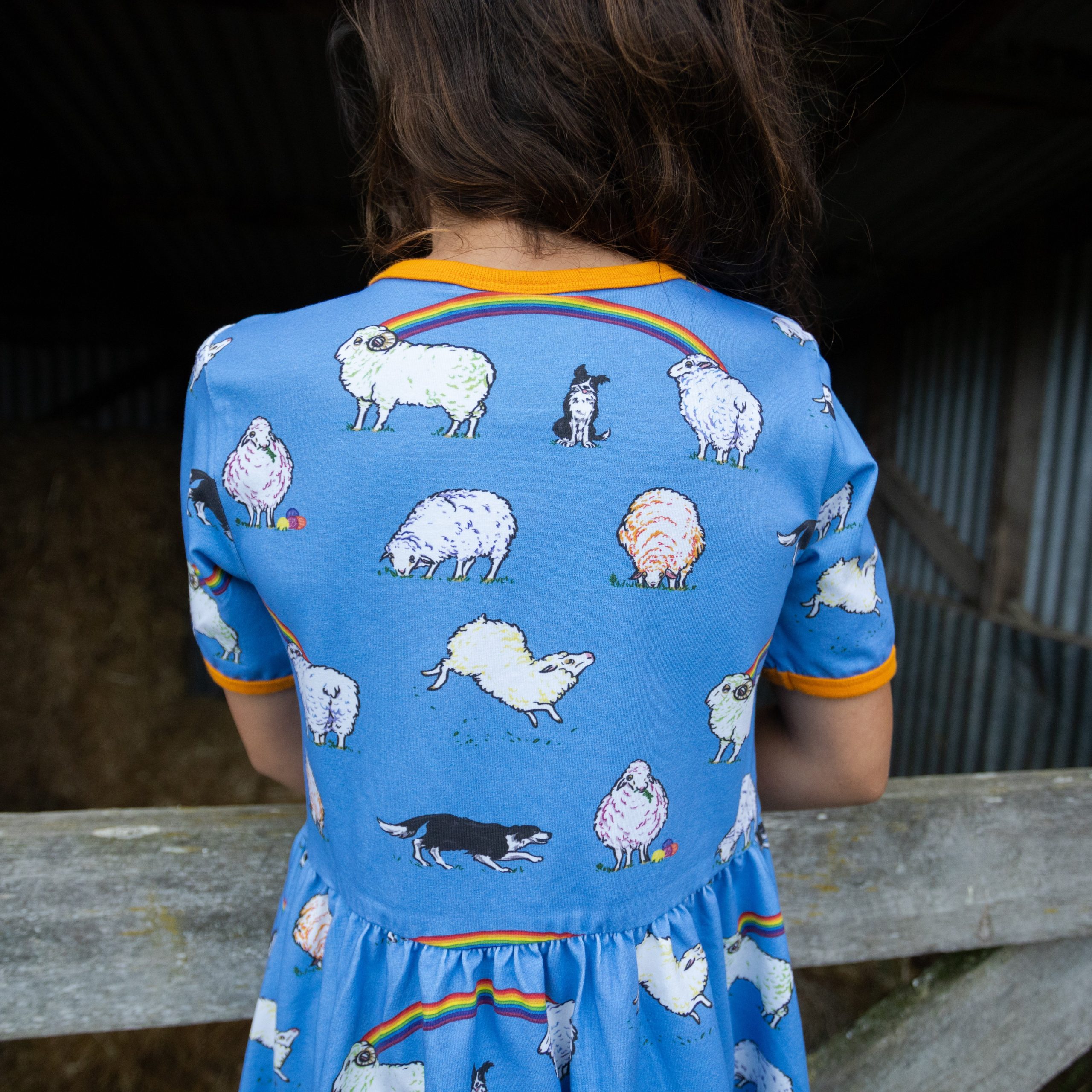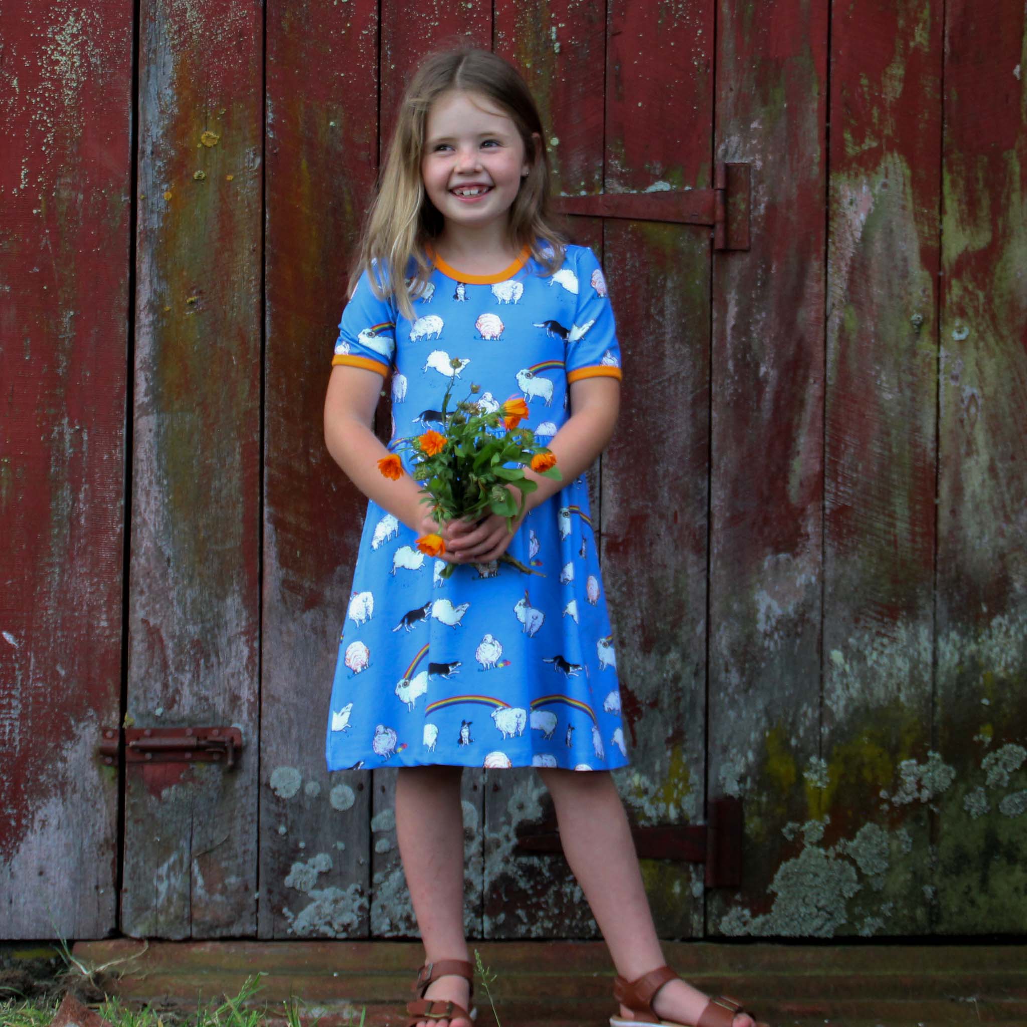 This beautiful short sleeved dress in cornflower blue features sheep with hints of rainbow colours and black and white sheep dogs amongst rainbows. It has beautiful orangey yellow binding at the neck and sleeves. It also has pockets for carrying treasures!