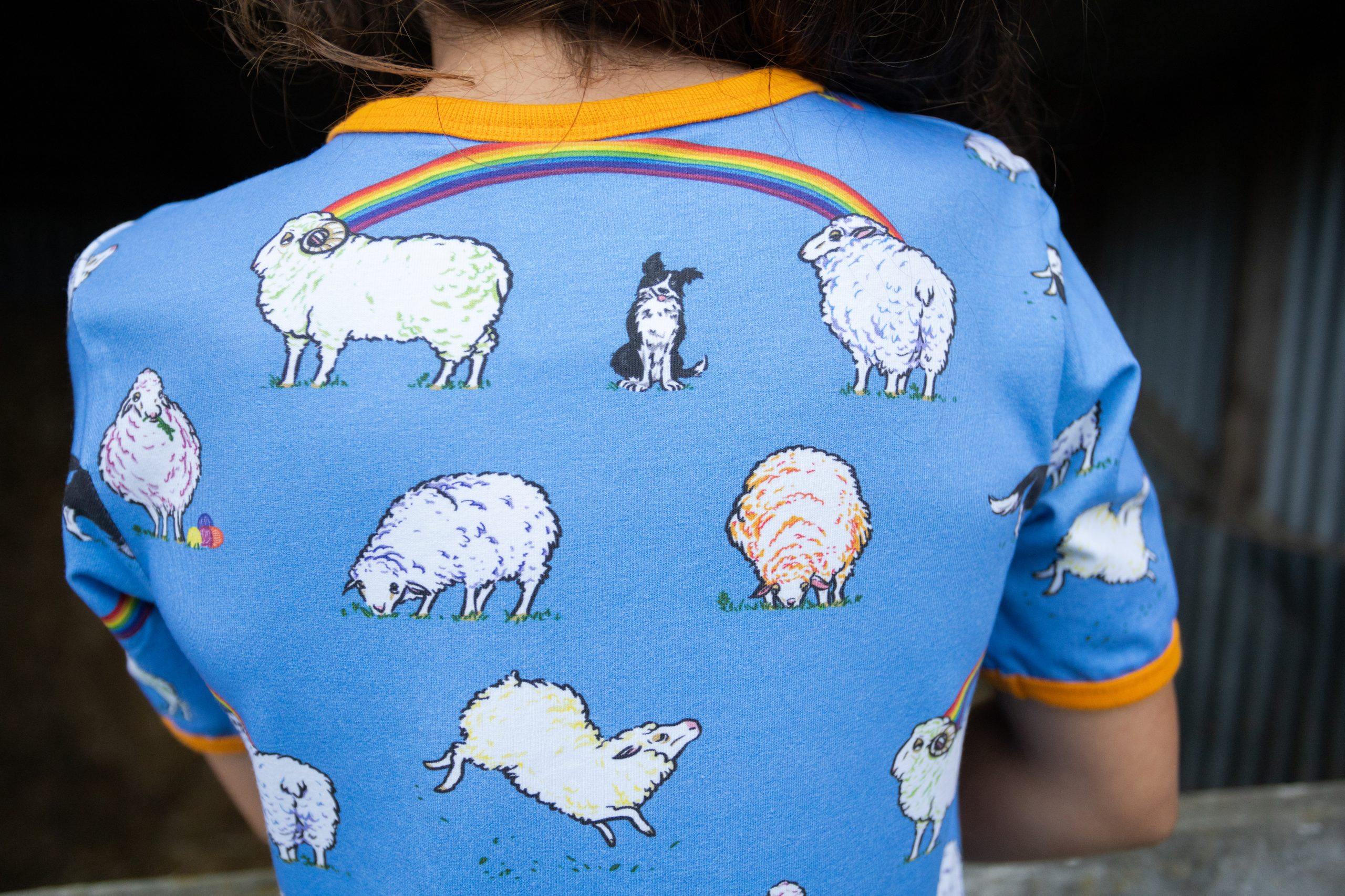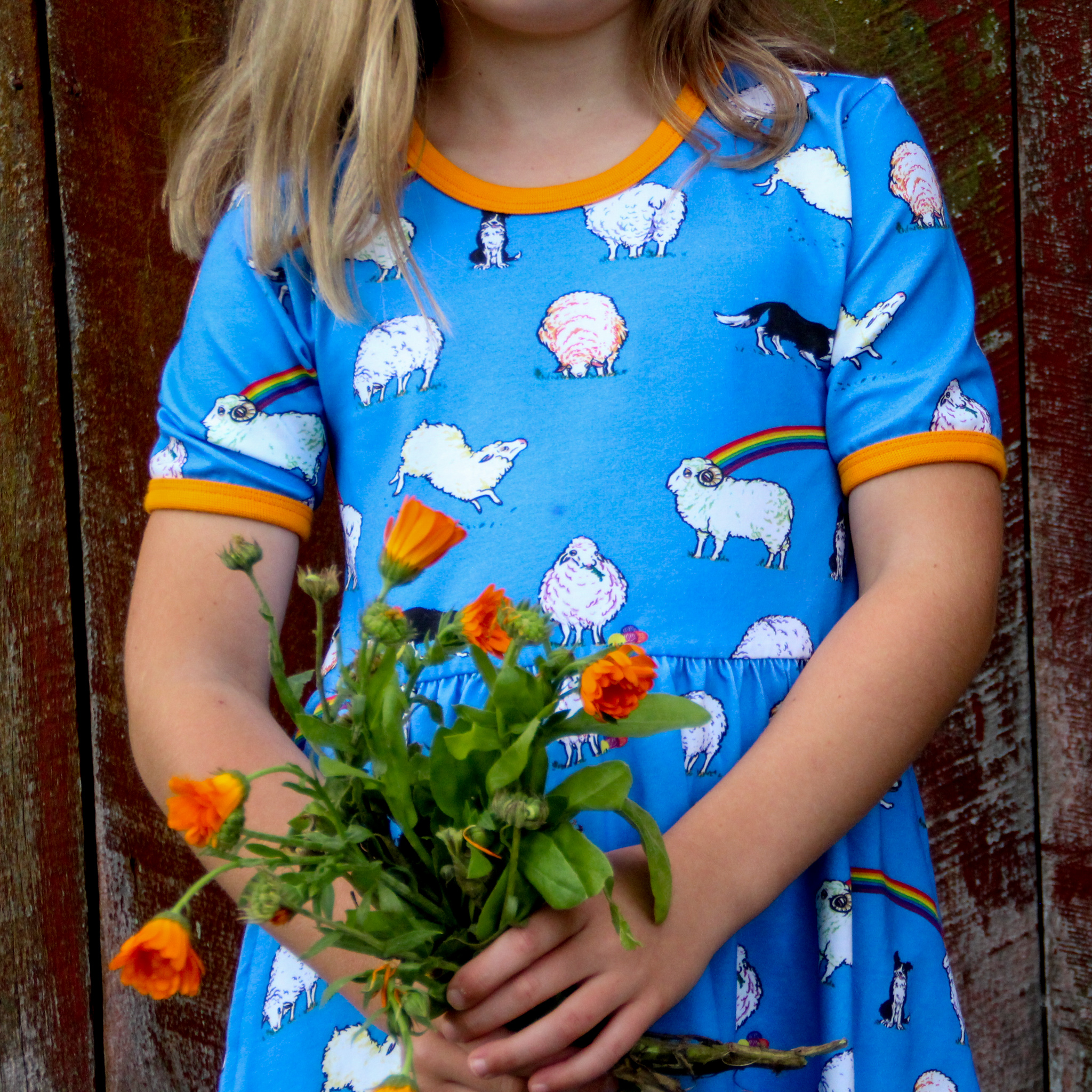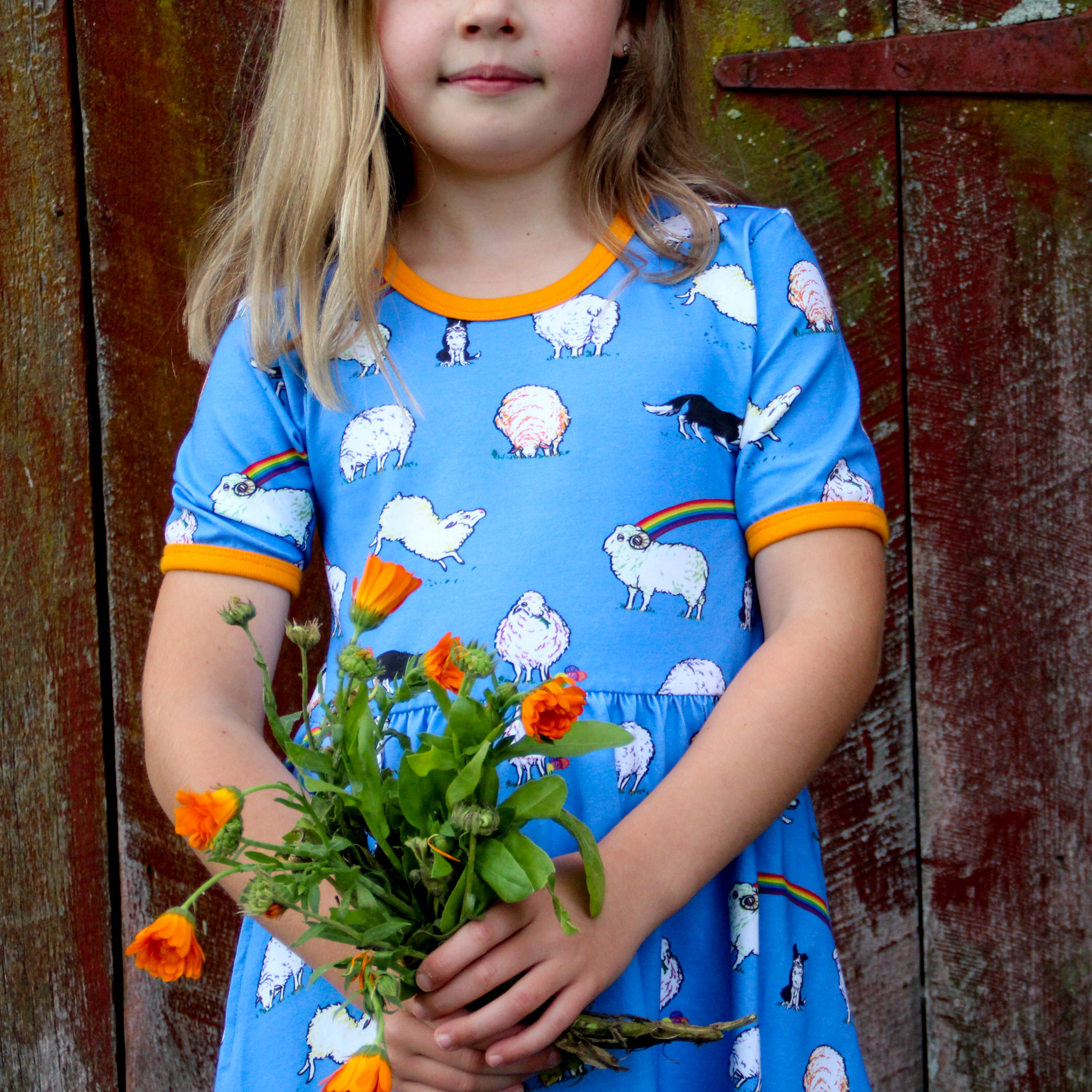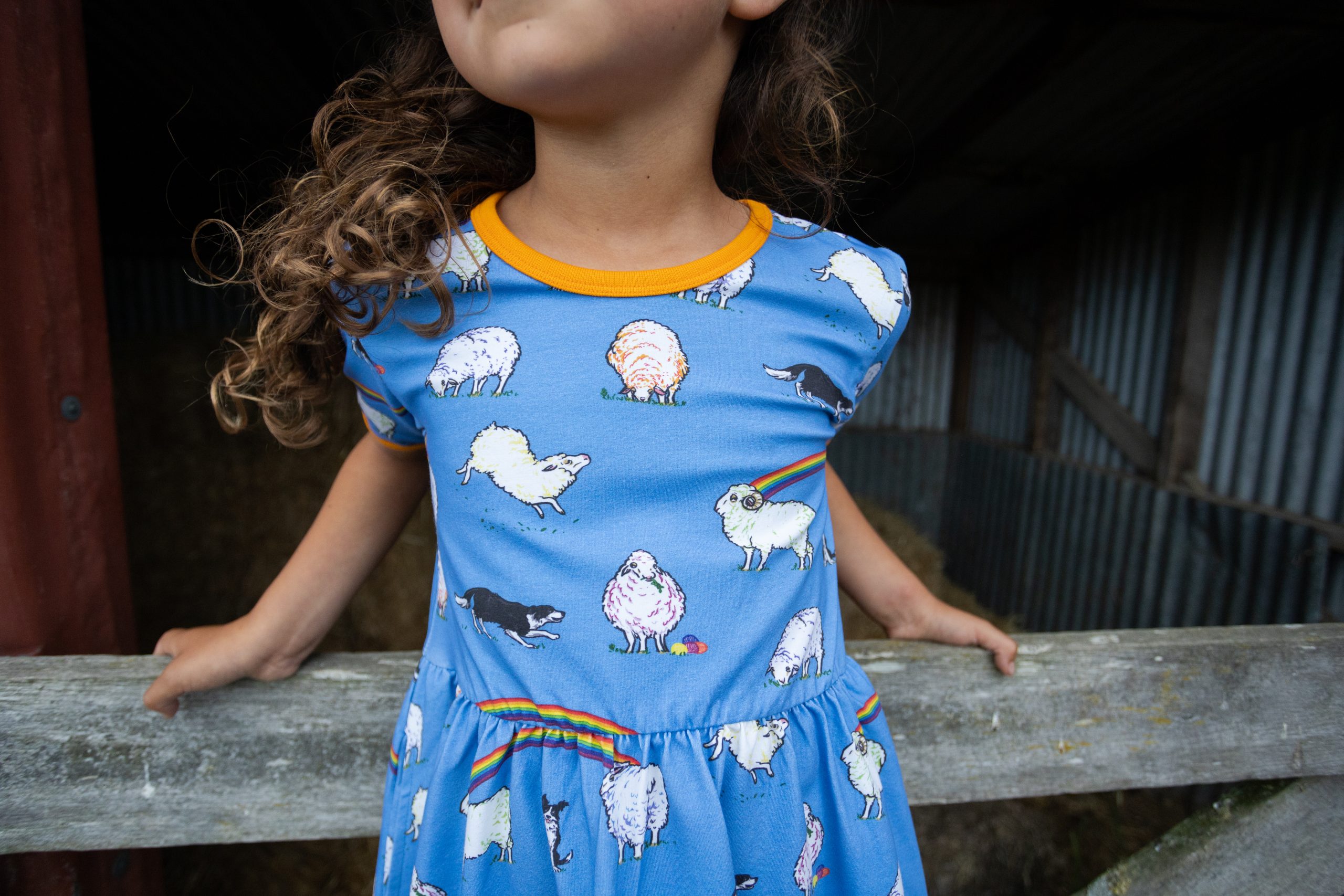 This beautiful short sleeved dress in cornflower blue features sheep with hints of rainbow colours and black and white sheep dogs amongst rainbows. It has beautiful orangey yellow binding at the neck and sleeves. It also has pockets for carrying treasures!