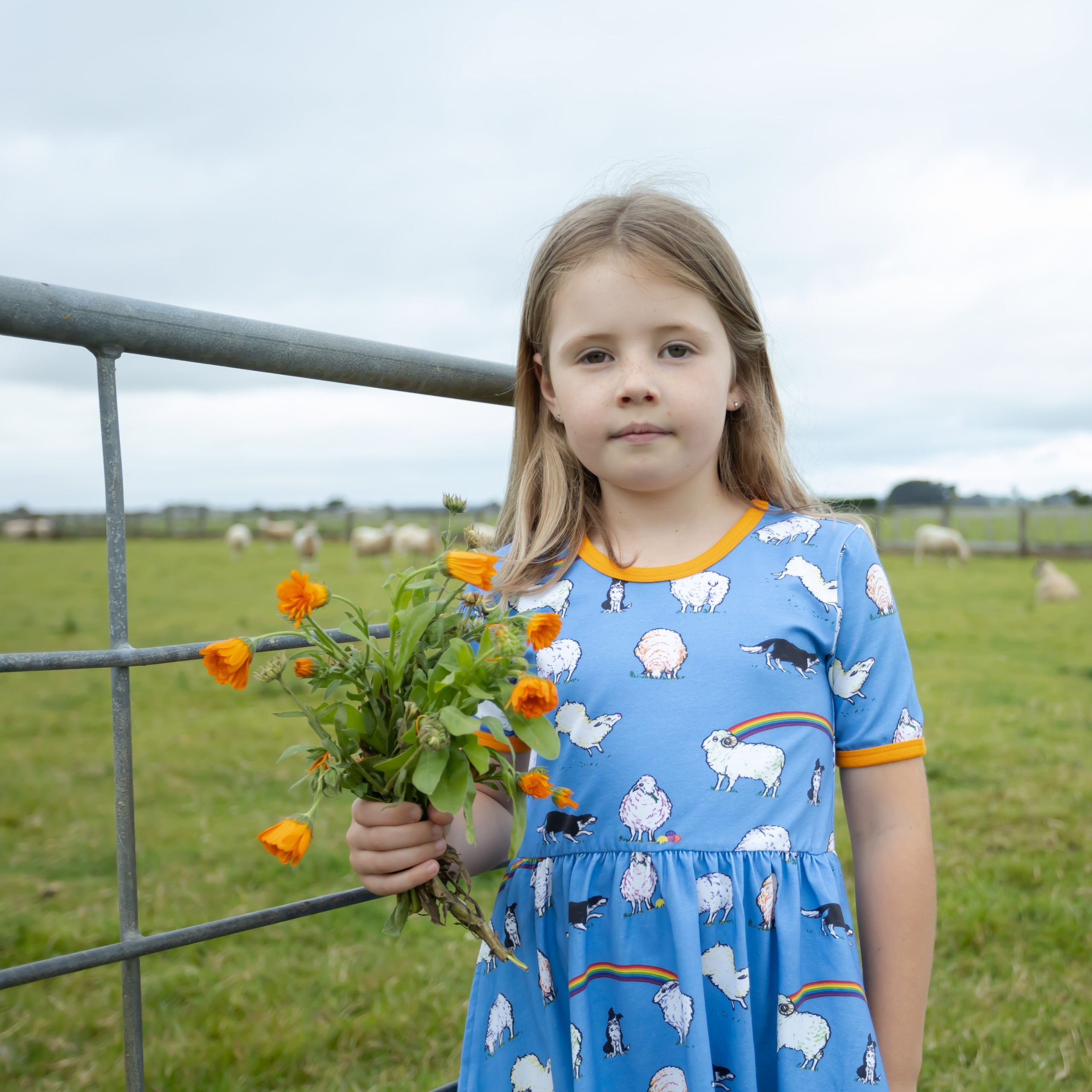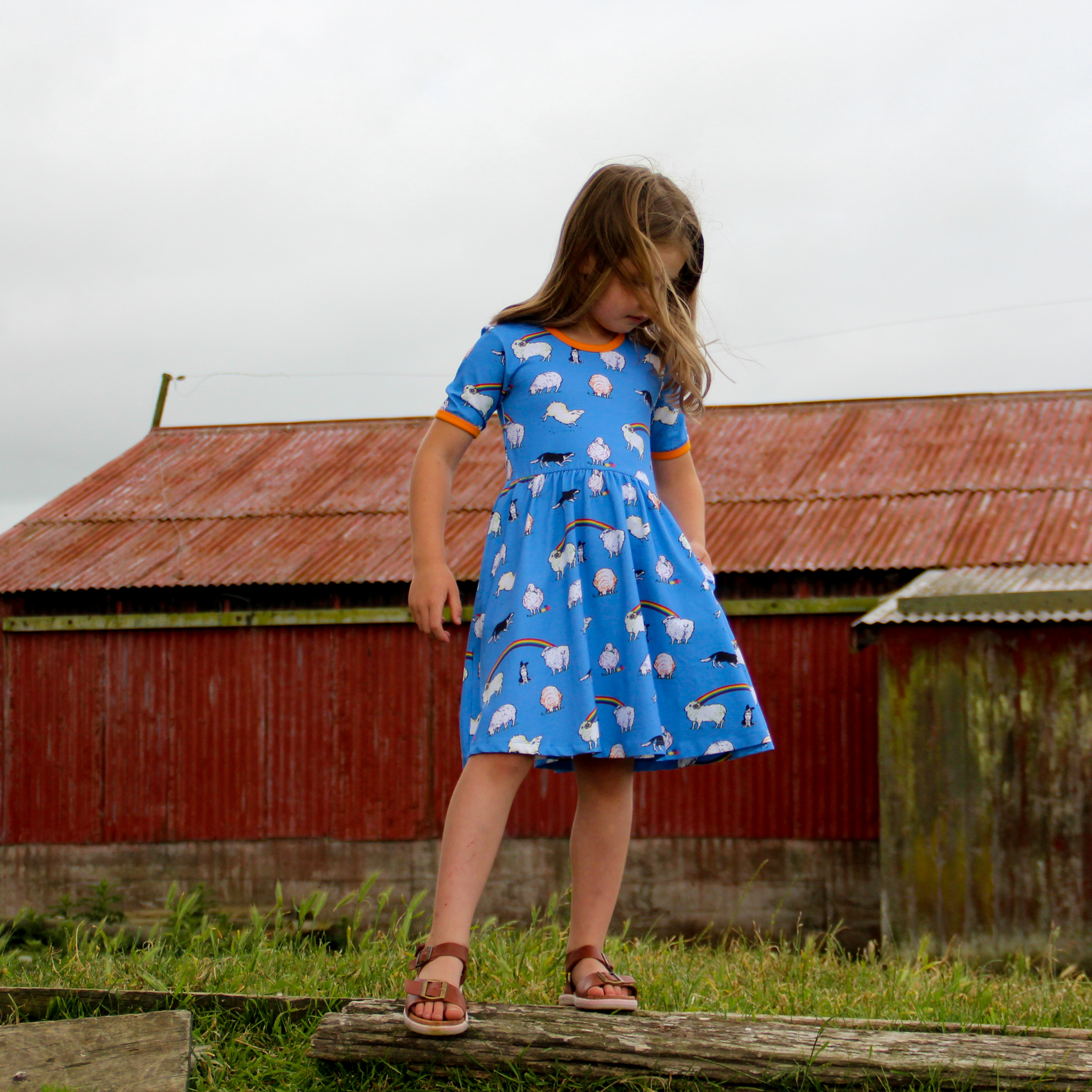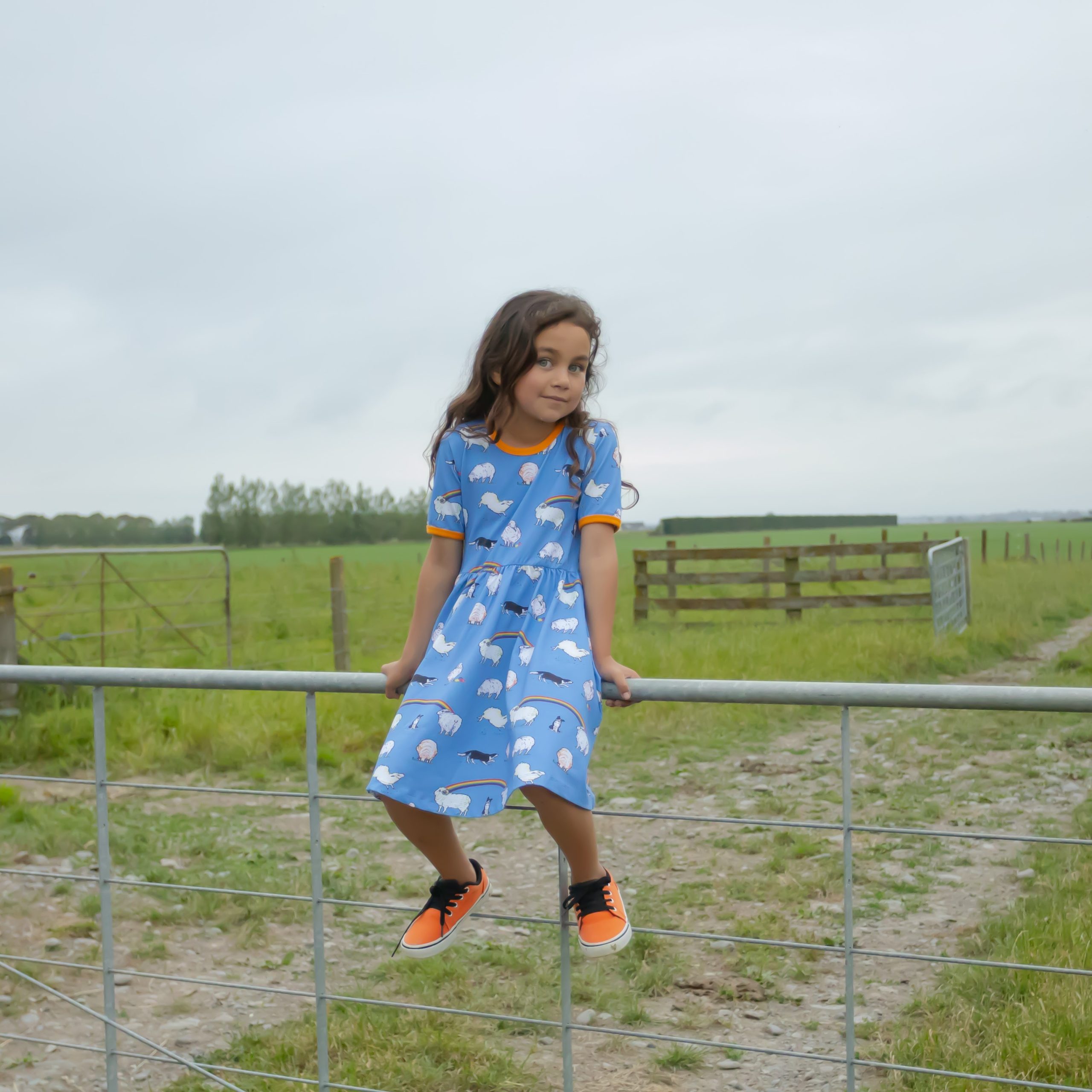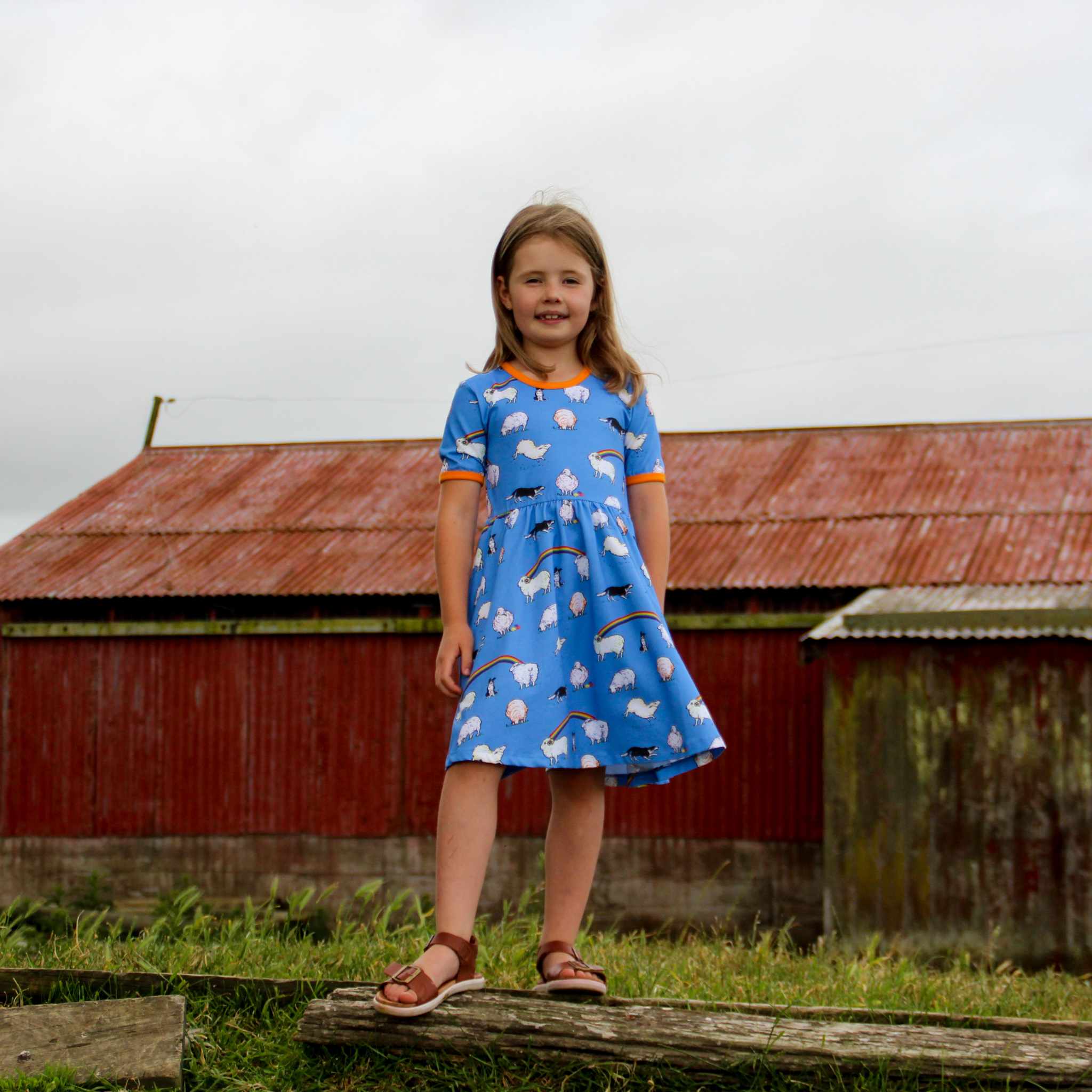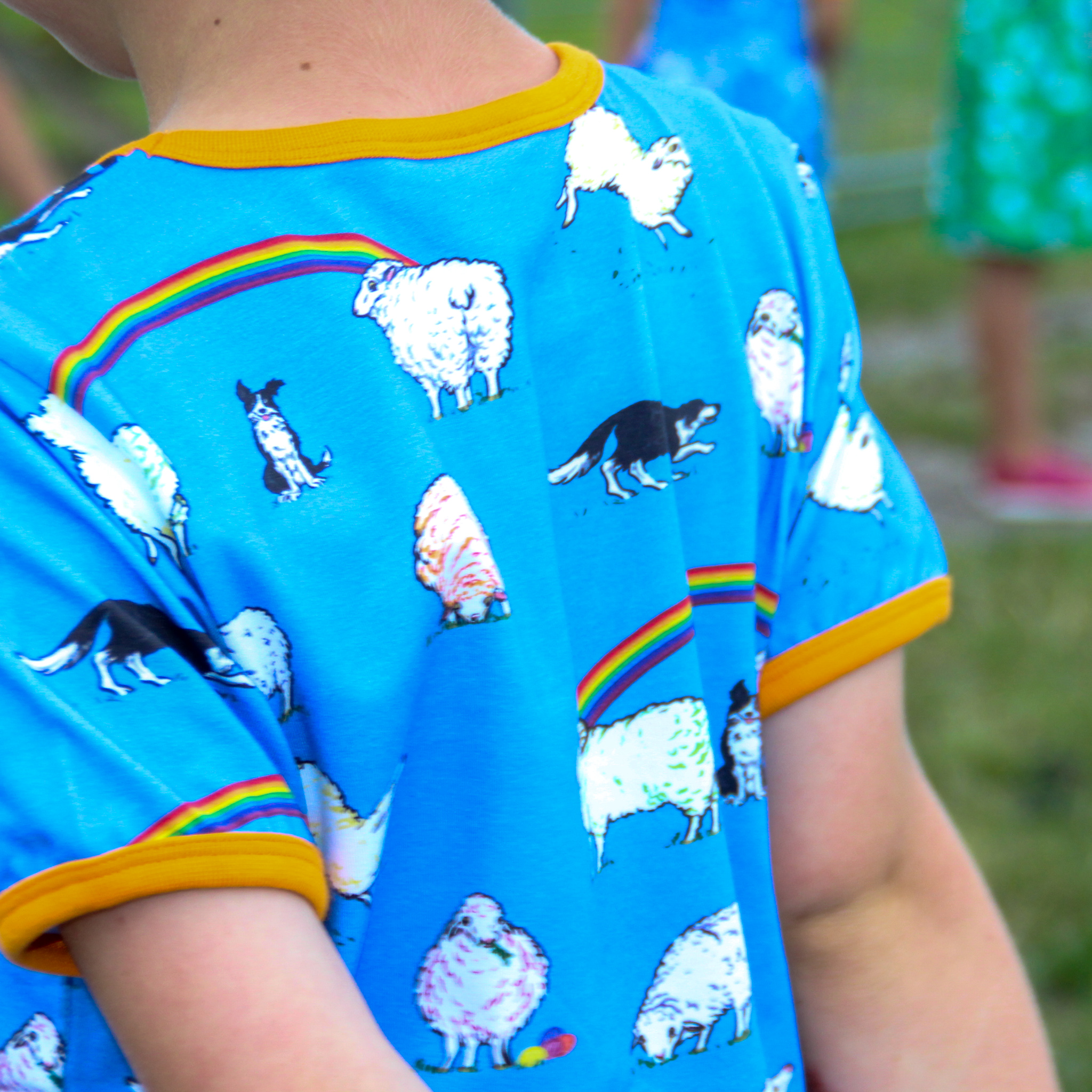 This beautiful short sleeved dress in cornflower blue features sheep with hints of rainbow colours and black and white sheep dogs amongst rainbows. It has beautiful orangey yellow binding at the neck and sleeves. It also has pockets for carrying treasures!