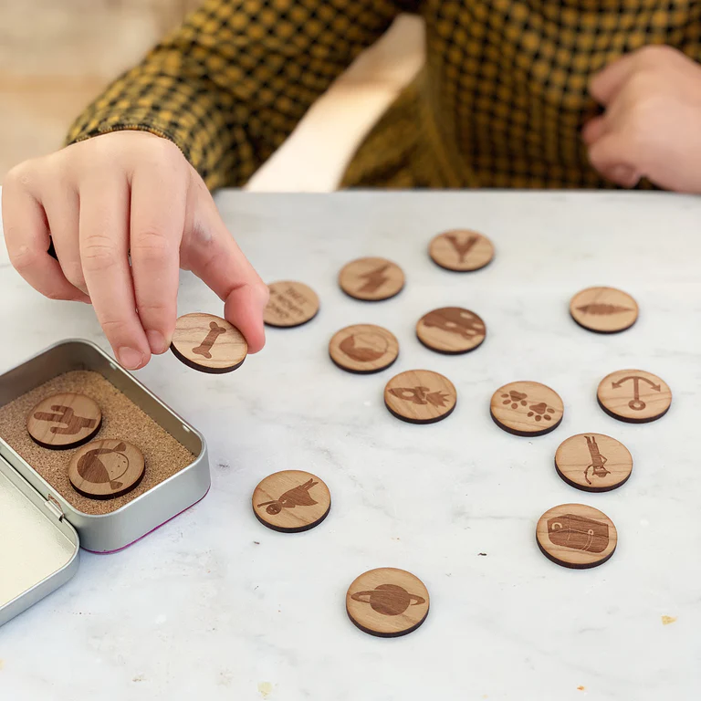 Children can create stories by choosing their favourite tokens one by one. Alternatively, with the blank sides facing up, they can take turns to pick up the token & use the pictures to guide their story. For more players, divide the tokens up, then take turns around the circle. Alternatively, create your own games & rules…