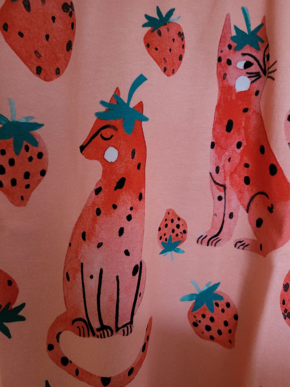 Gorgeous organic cotton short sleeved t-shirt with peach background and red ribbing at the neck and sleeves.  The print features spotted red cats and strawberries, the cats have green leaves on their heads as if they’ve been plucked from a strawberry plant too.