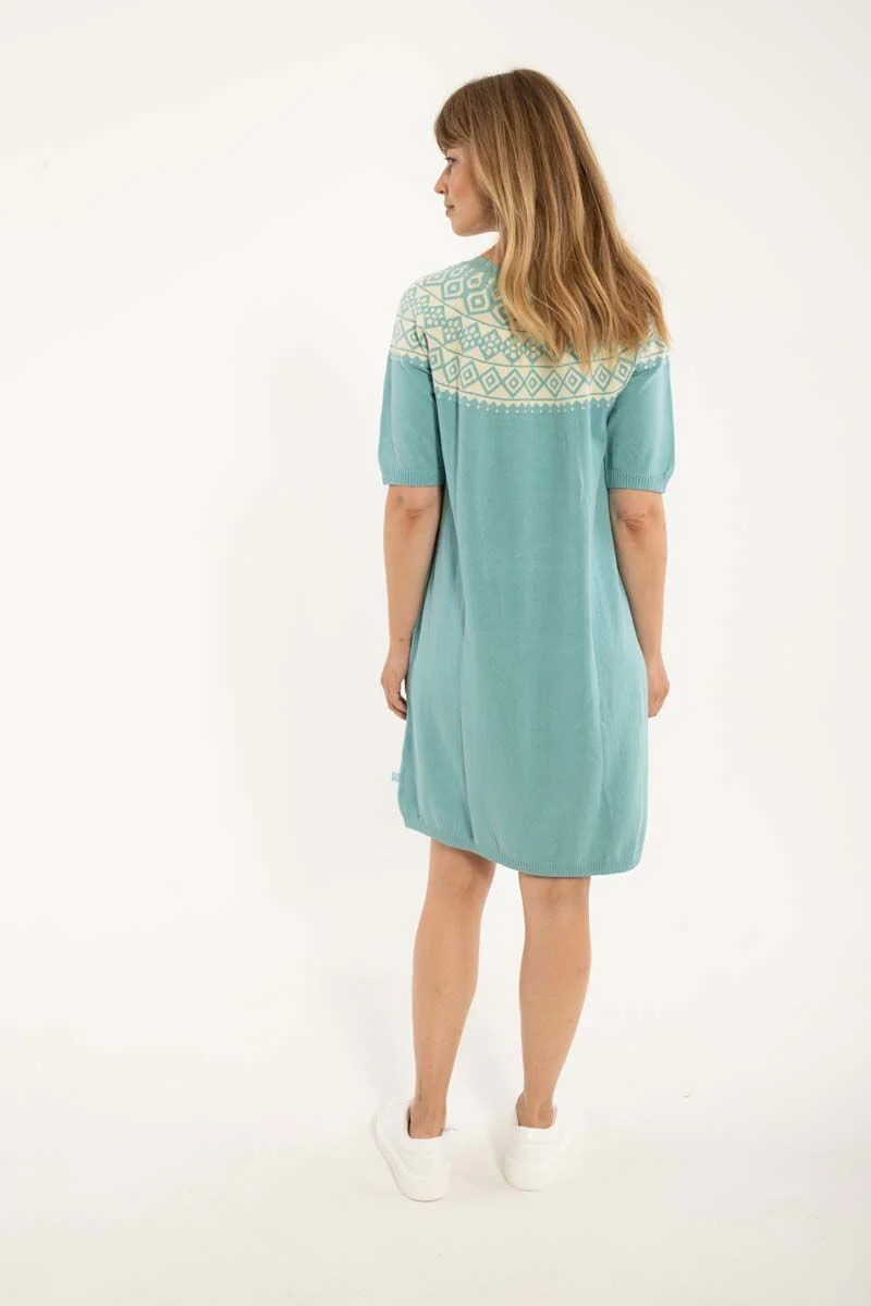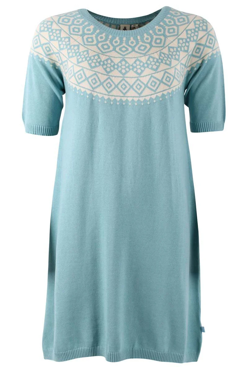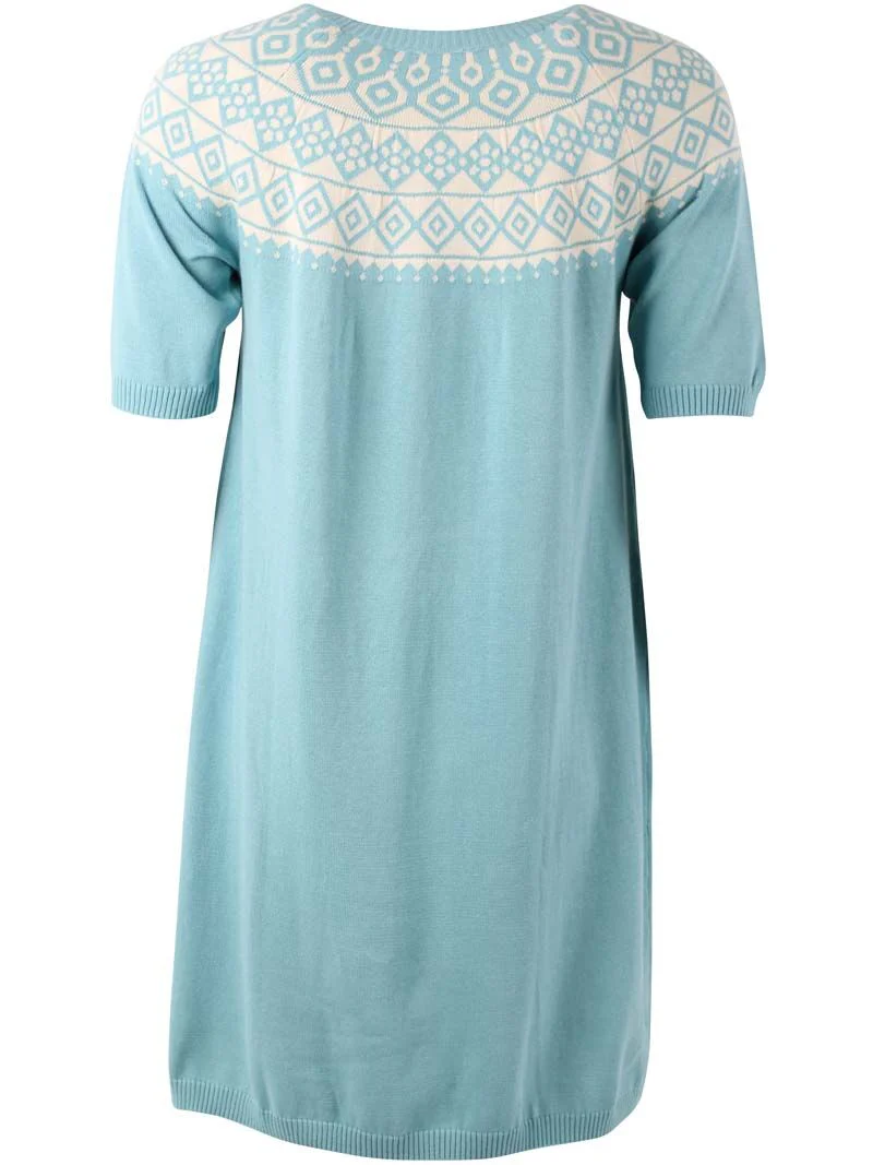 – Feminine knit dress with t-shirt sleeves – Beautiful blue color with Nordic pattern – 100% cotton Feminine knit dress with t-shirt sleeves, perfect for a warm spring day. The knitted dress has a beautiful blue color with a Nordic pattern around the neck and it falls nicely on the body. Combine the dress with a pair of nice boots or cool sneakers to create an elegant and feminine look. Material: 100% cotton The material is Oeko-tex certified Responsible production is a matter of course. We only work with BSCI certified manufacturers, which we visit annually to ensure we can vouch for working conditions. In addition to following all applicable European and Danish legislation, our products also follow a very special and stricter Danefæ set of rules for the use