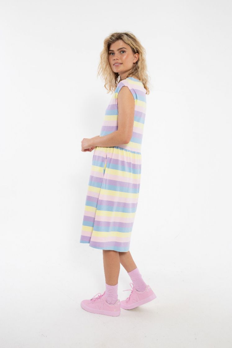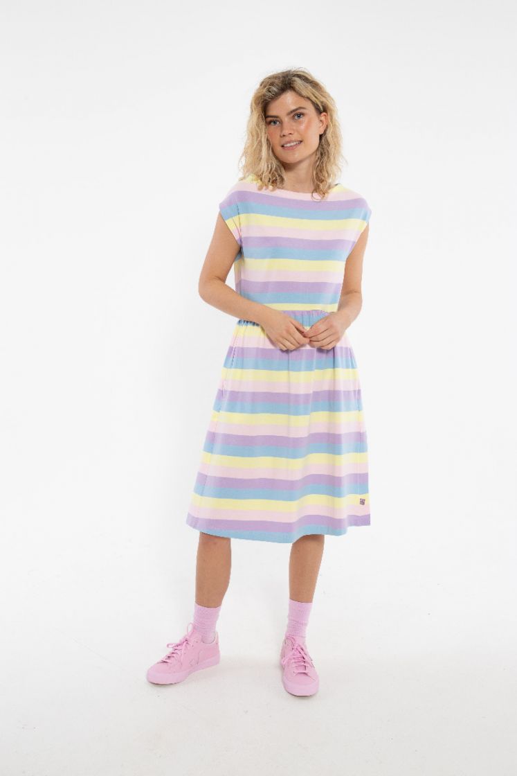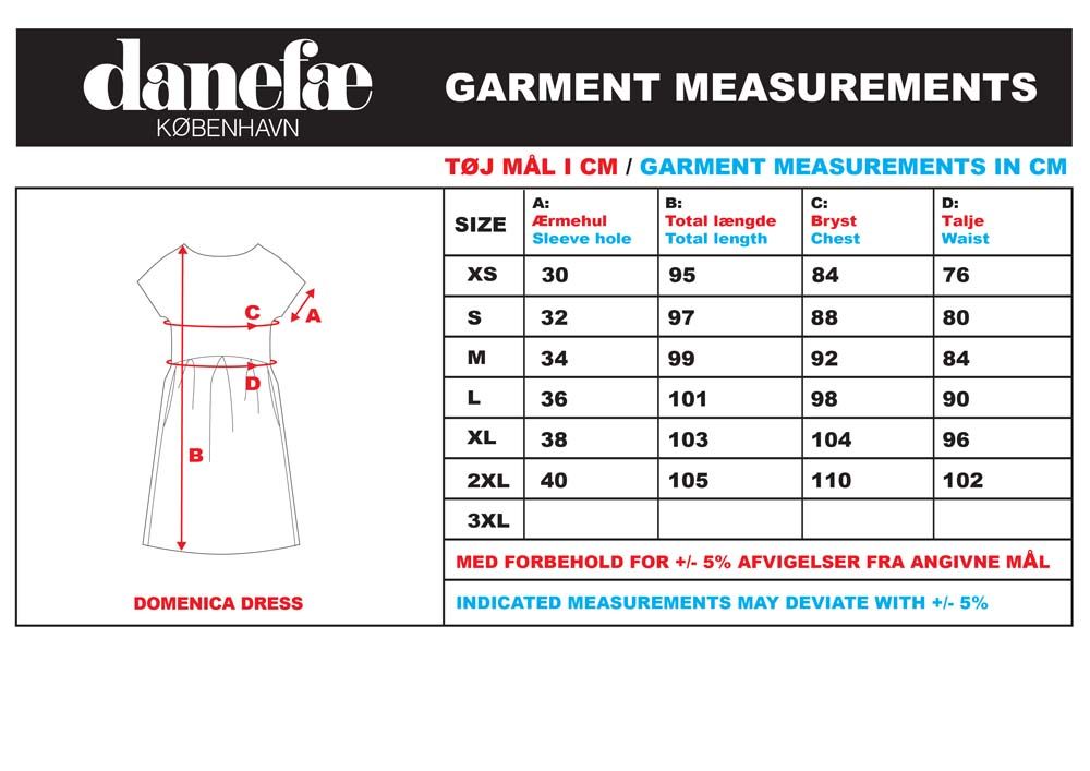 Really cute and feminine dress in soft slub jersey. Beautiful colors. The dress has short sleeves and a boatneck. Cut at the waistline with a bit of puckering and side pockets. The perfect everyday companion on those warm summer days! 95% cotton / 5% elasthane. Responsibility and quality are two of Danefæ’s core values. Therefore, we only work with BSCI-certified manufacturers, which we visit annually to make sure we can vouch for the working conditions. In addition to complying with all applicable European and Danish legislation, our products also follow a very special Danefæ set of rules for the use of chemicals, ensuring durability and guaranteeing beauty wash after wash.