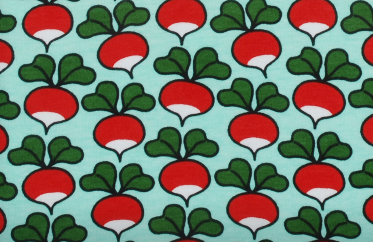 Gorgeous scoop neck dress with elbow length sleeves in the famous radish print on a beautiful blue / green sea glass background. Please note that I don’t have a photo of this dress in this fabric. I’ve provided a photo of the style of dress in a different colourway and the main photo shows the colour of the dress that you will receive.