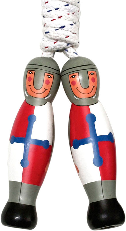 I love these beautiful skipping ropes, they’re so bright and happy! This skipping rope features two smiling knights in red, white and blue, they wear grey helmets and have pale skin.