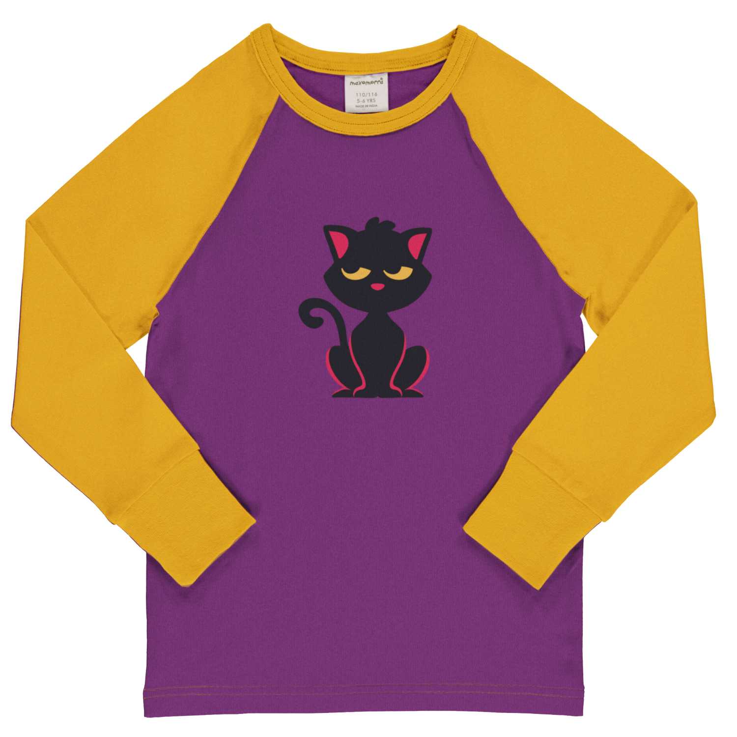 Purple background with single black cat print, yellow raglan sleeves and yellow ribbing at neck and cuffs.
