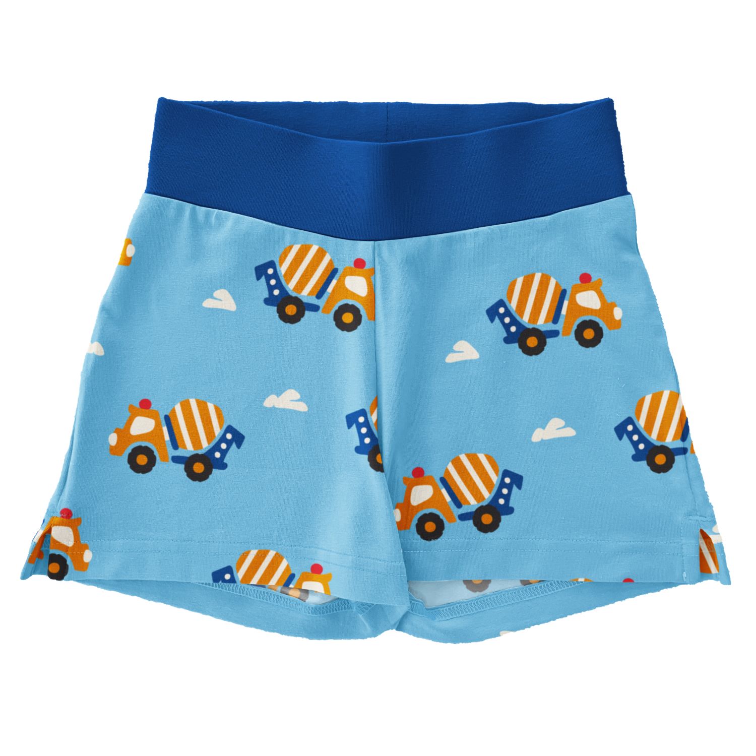 Pale blue shorrts featuring cement trucks in orange, white and black, dark blue waistband.