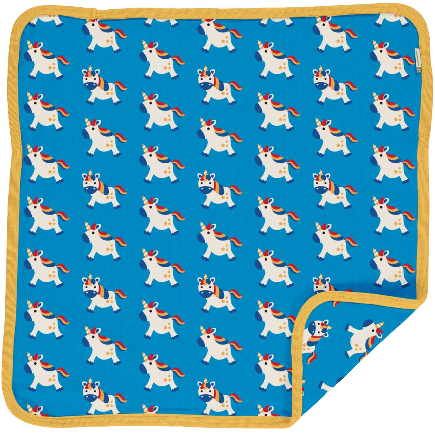 Tales Unicorn: A blue background with white and rainbow coloured unicorns. Yellow trim.