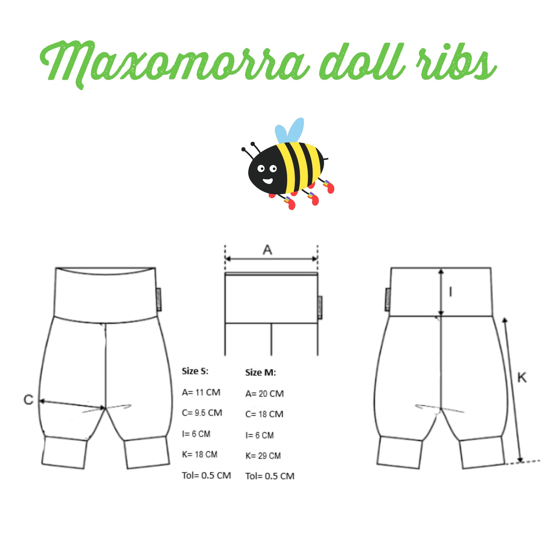 Trousers for dolls in soft cotton jersey with ribbed folded waist and ankle cuffs.