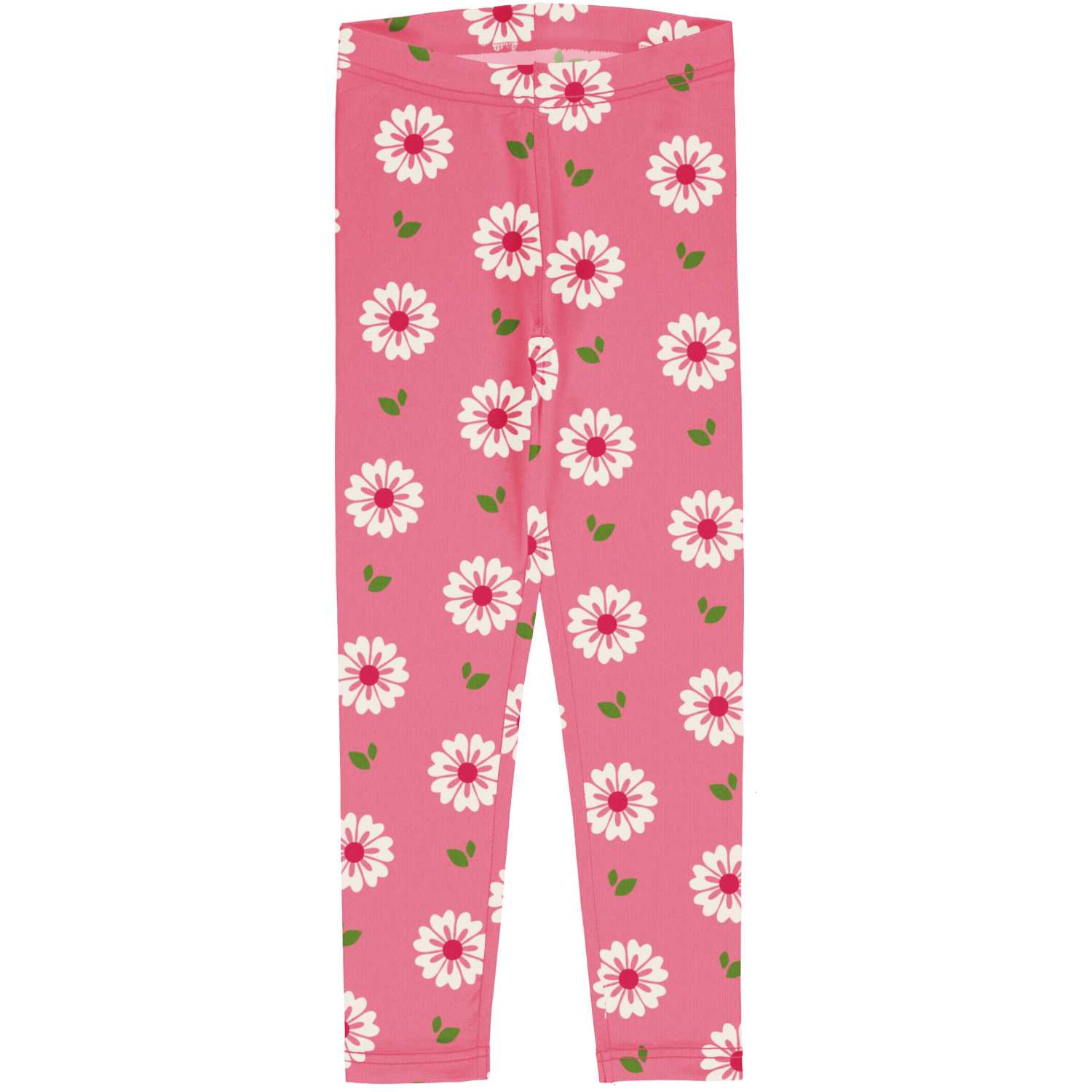 GOTS CERTIFIED organic bright pink leggings in soft cotton jersey with elasticated waist and sideseam-less construction for added comfort. They feature an all over white flower print.  95% Organic Cotton and 5% Elastane.
