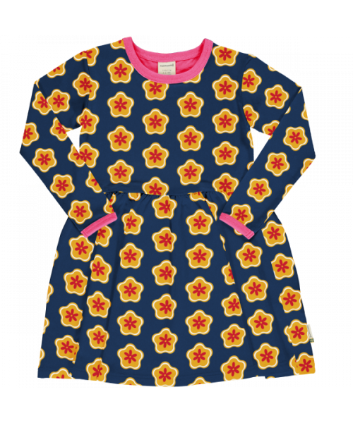 Nordic Mullein: Dark blue long sleeved dress with yellow, orange and red flowers with bright pink binding.