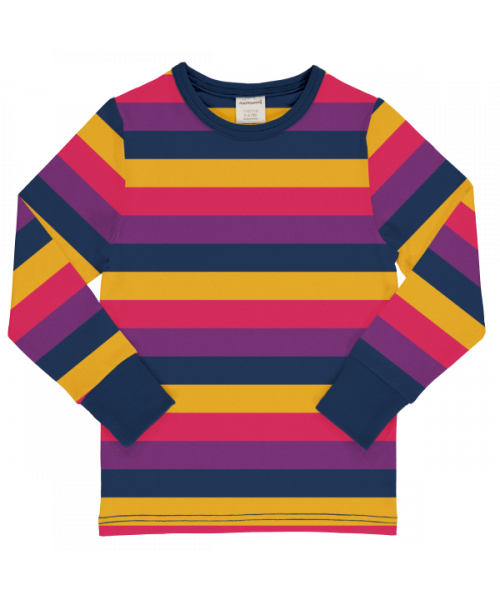 Long sleeved top with horizontal stripes in navy blue, purple, yellow and pink.