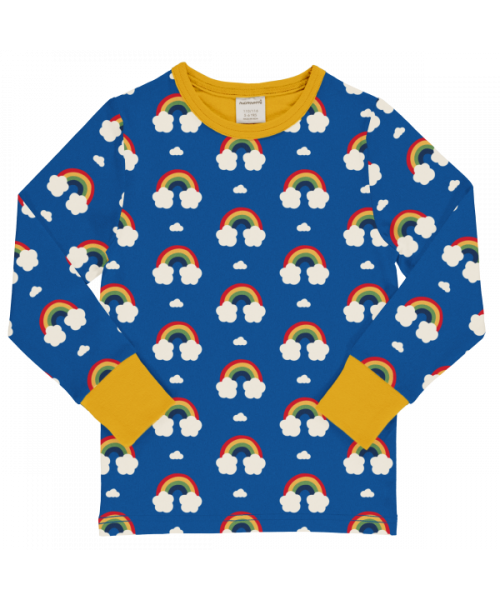 Blue background with rainbow and cloud print, yellow ribbing at neck and cuffs.
