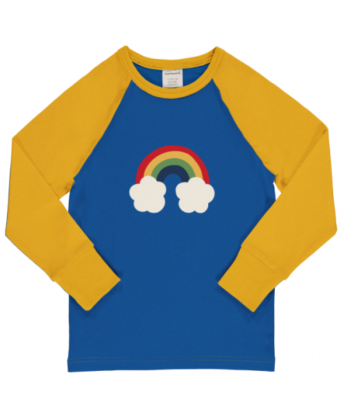 Blue background with single rainbow and cloud print, yellow raglan sleeves and ribbing at neck and cuffs.