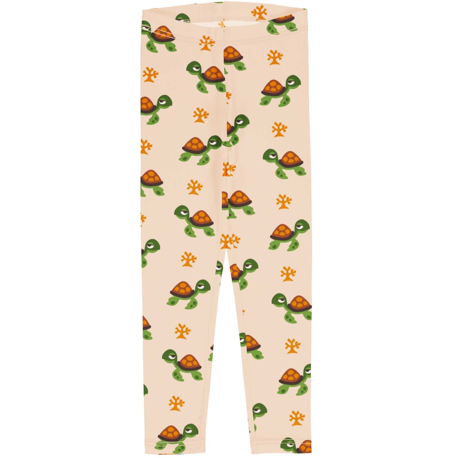 GOTS CERTIFIED organic Leggings in soft cotton jersey with elasticated waist and sideseam-less construction for added comfort. Cream background featuring green and brown turtles.  95% Organic Cotton and 5% Elastane.