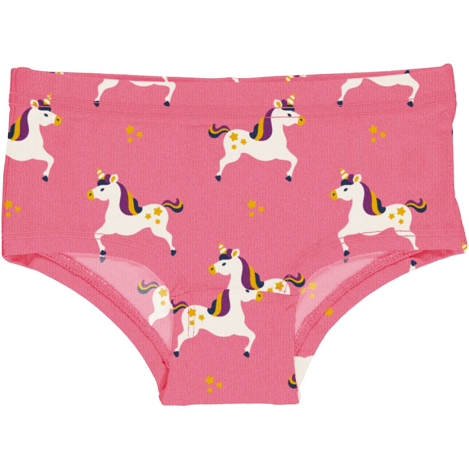 GOTS CERTIFIED pink organic briefs in soft cotton jersey with elasticated waist and double fabric crotch gusset. All over unicorn print.  95% Organic Cotton and 5% Elastane.