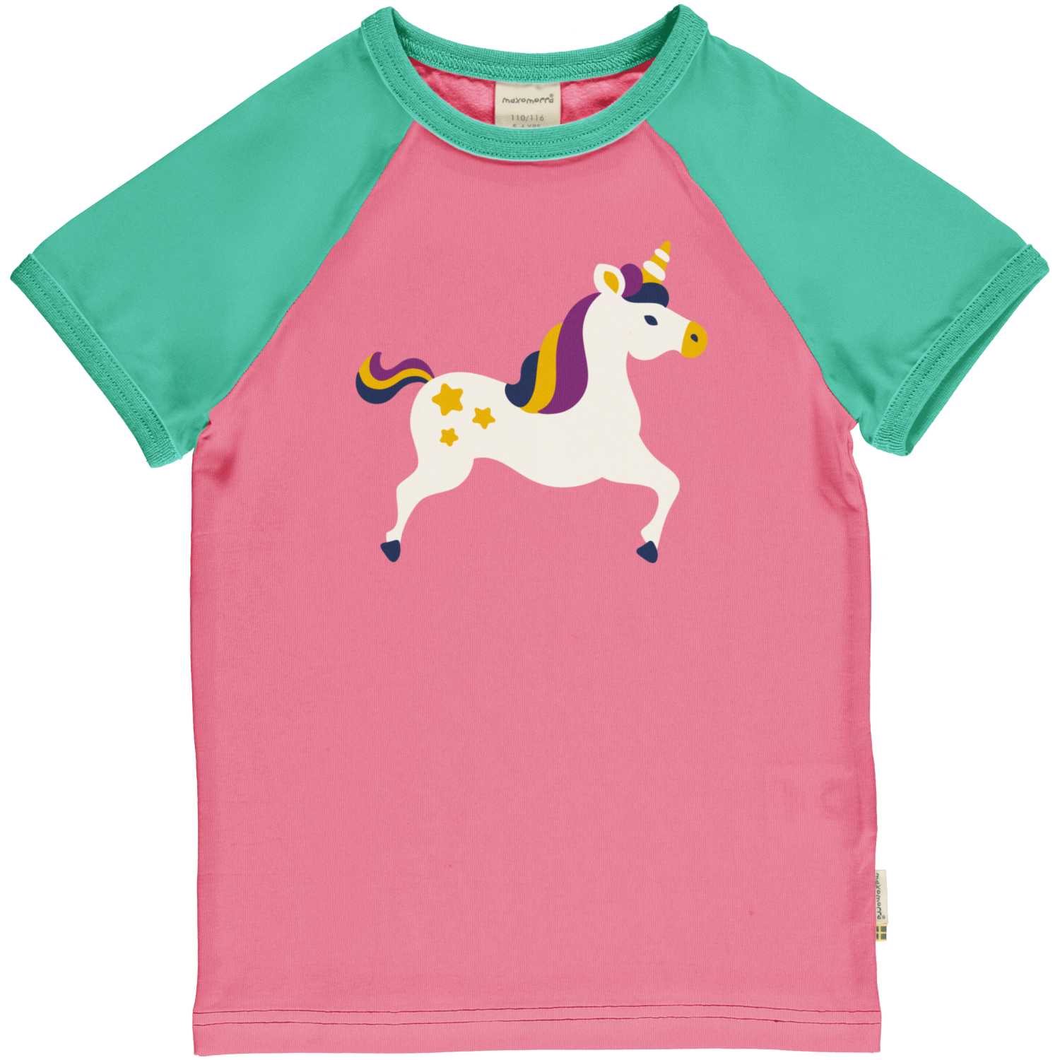 GOTS CERTIFIED organic Top with a short raglan sleeve in green and a single unicorn print on the pink body.  95% Organic Cotton and 5% Elastane.