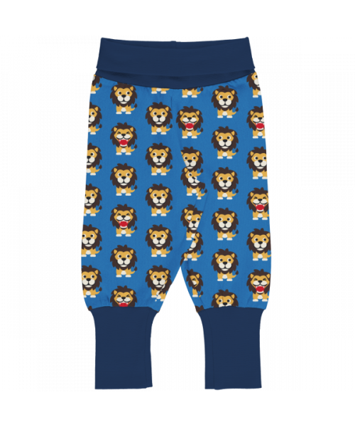 Lion: Bright blue trousers with navy blue waist and ankle cuffs covered in lions.