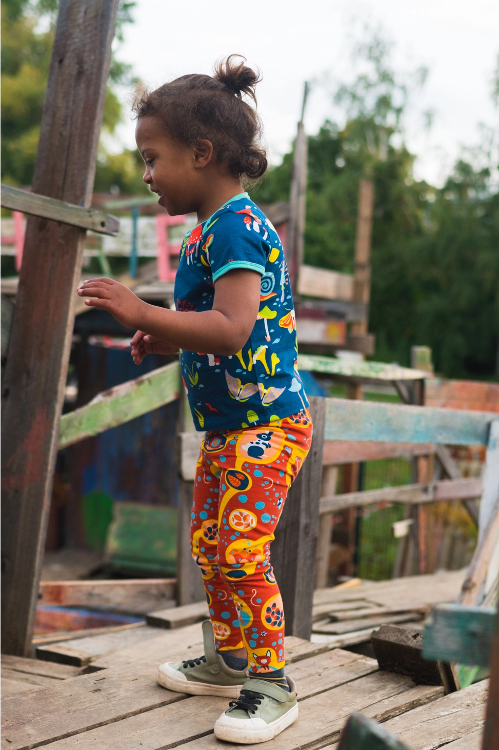 Our colourful leggings are so versatile! They can be worn on their own or as a base layer under skirts, shorts, you name it! Made of 100% organic cotton, they are buttery soft. In addition, since our labels are printed right on the inside of the fabric, children with sensitive skin won’t have to deal with scratchy label.