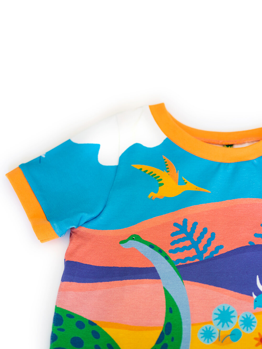 This very bright design represents many dinosaurs frolicking in a multicolor environment. A friendly diplodocus is walking over the side of the shirt. I am the one creating all the designs you’ll find here, they’re unique!
