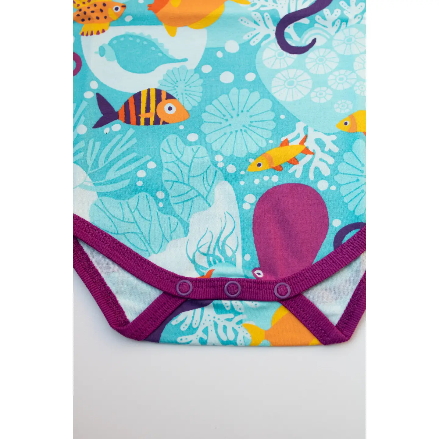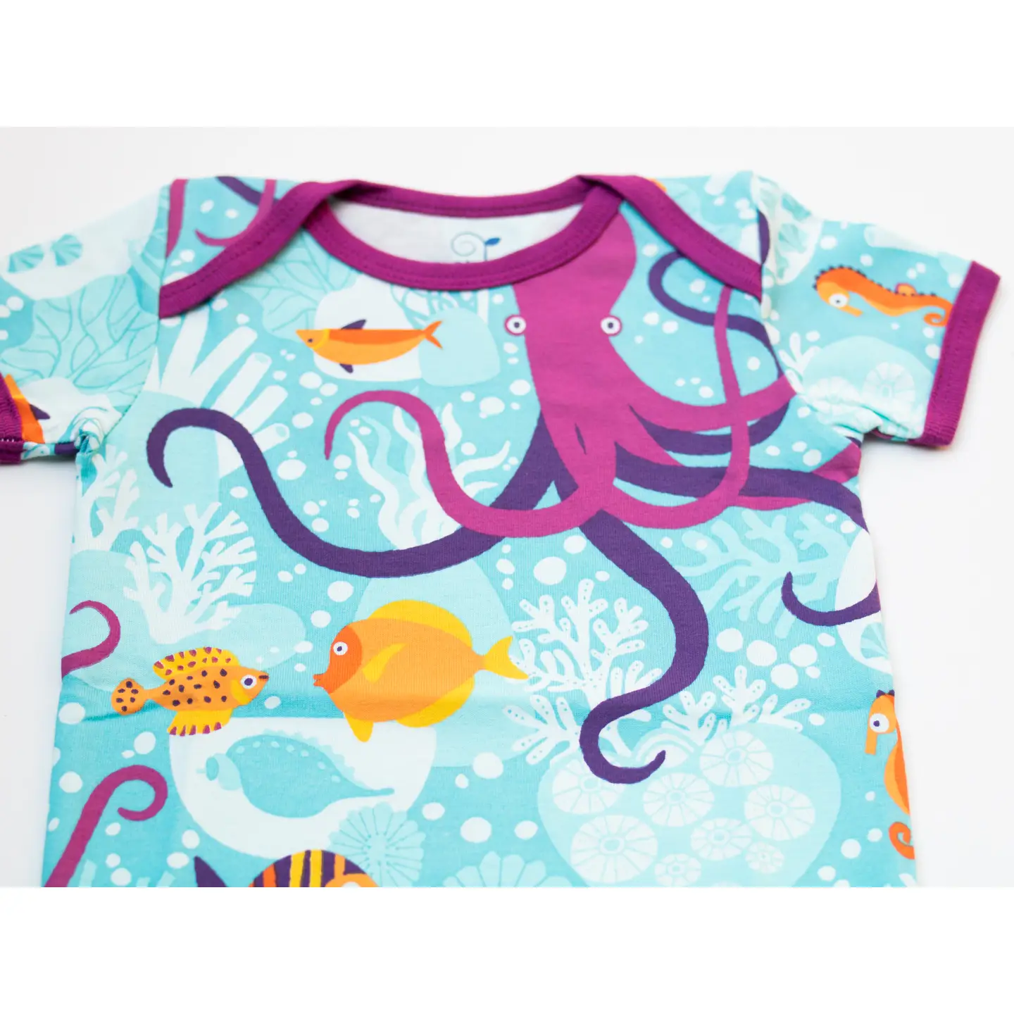 Beneath its mirror-like surface, the ocean is a complex world in itself, invisible to most of us. I wanted to capture some of the magic and wonder of this important ecosystem in this design. It features a coral reef with beautiful shells, colourful fish and a large octopus that is sure to be the highlight! Merle Kids’ products are made of 100% organic cotton.