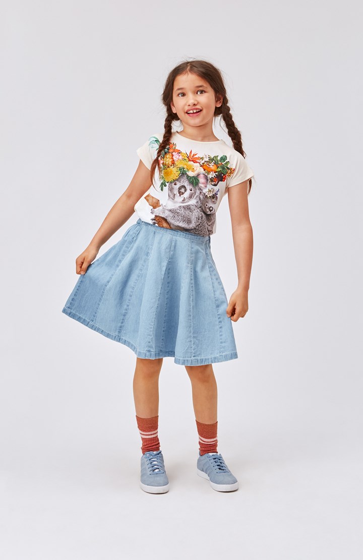 Ragnhilde is an off-white t-shirt in organic cotton that is slightly longer in the back. The front has the Fruitastic print that shows a koala mother and her young, ready for a party with tropical flowers and fruits on their heads. This Molo product is GOTS certified organic, which means that it is made with certified organic materials and produced under the strictest social and environmental standards throughout the entire manufacturing process. Inaddition, the GOTS certification secures that the product is free of hazardous chemicals. This Molo product is GOTS certified organic by Ecocert Greenlife, certification number 197496.