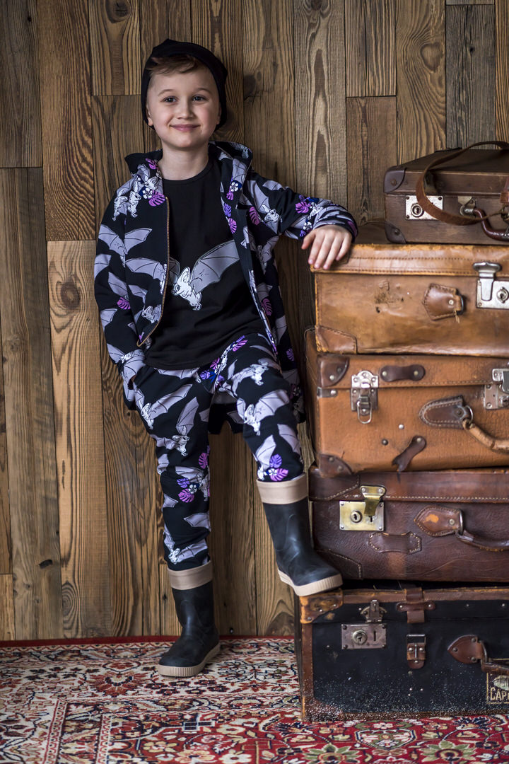 Treat the photos for illustration only – the arrangement of the pattern on each product may differ.Black bat – silver grey bats amongst pink and purple flowers on a black background.