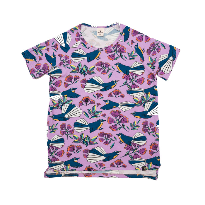 Gorgeous lilac t-shirt featuring blue, yellow and white fantail birds amongst green and yellow foliage with pink flowers.
