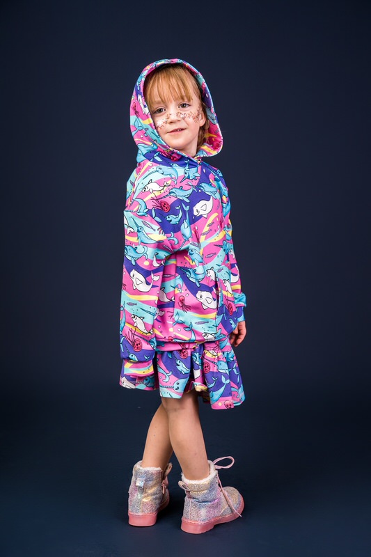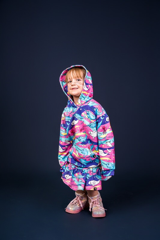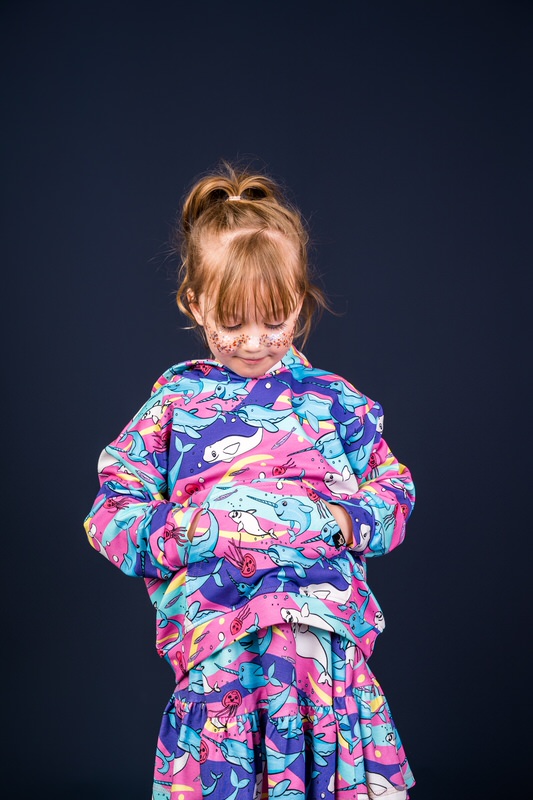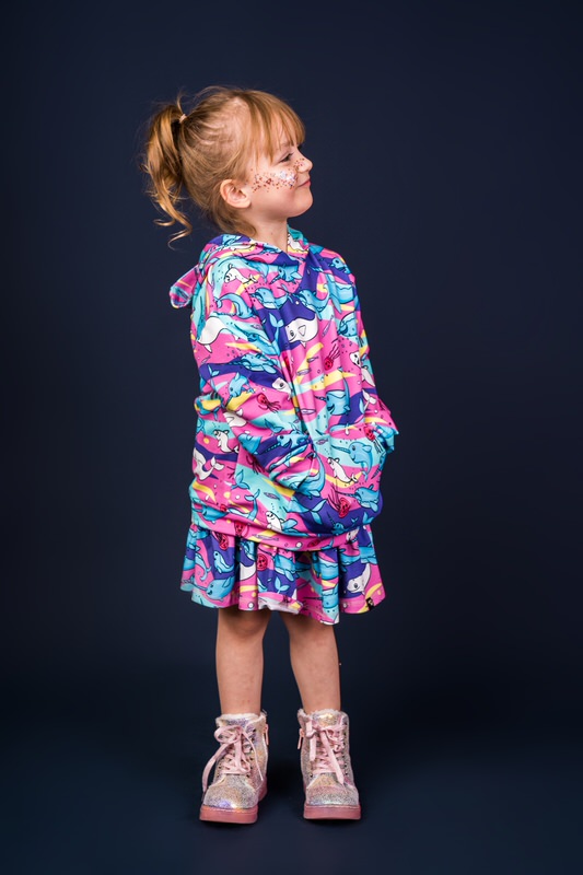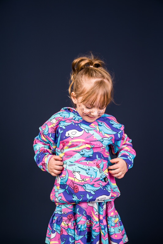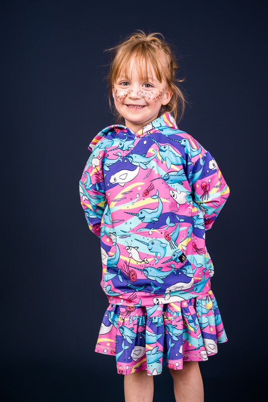 Gorgeous hoodie with kangaroo pocket, covered in blues, pinks and purples with a super cute narwhal print.