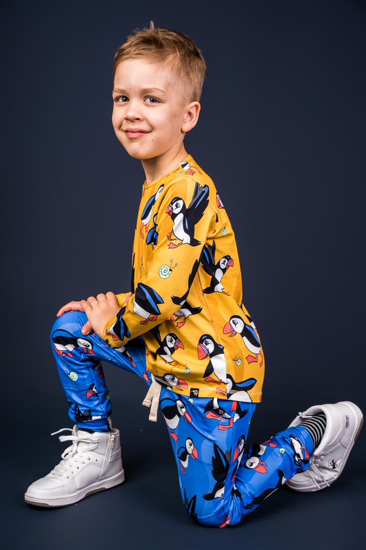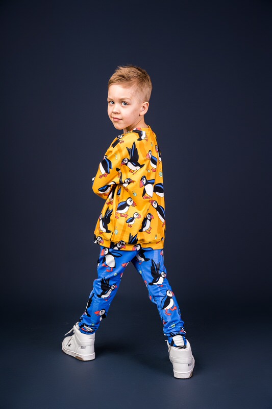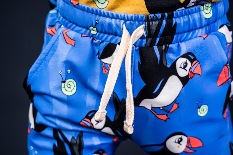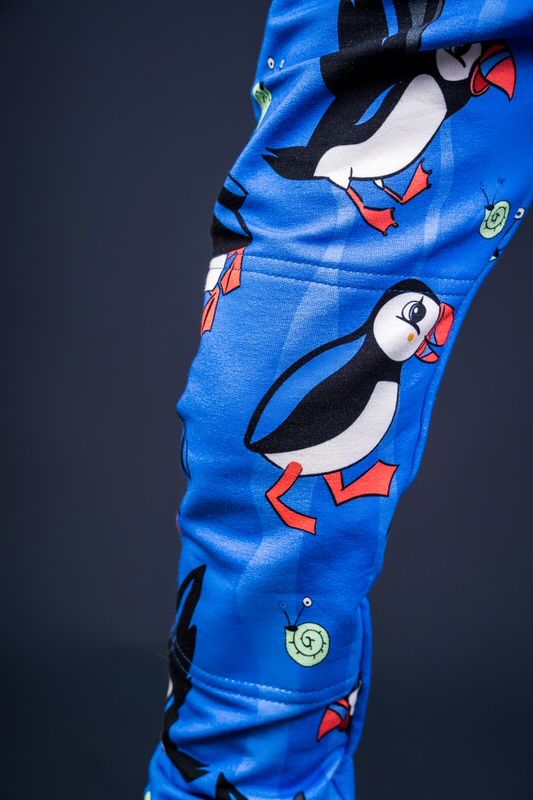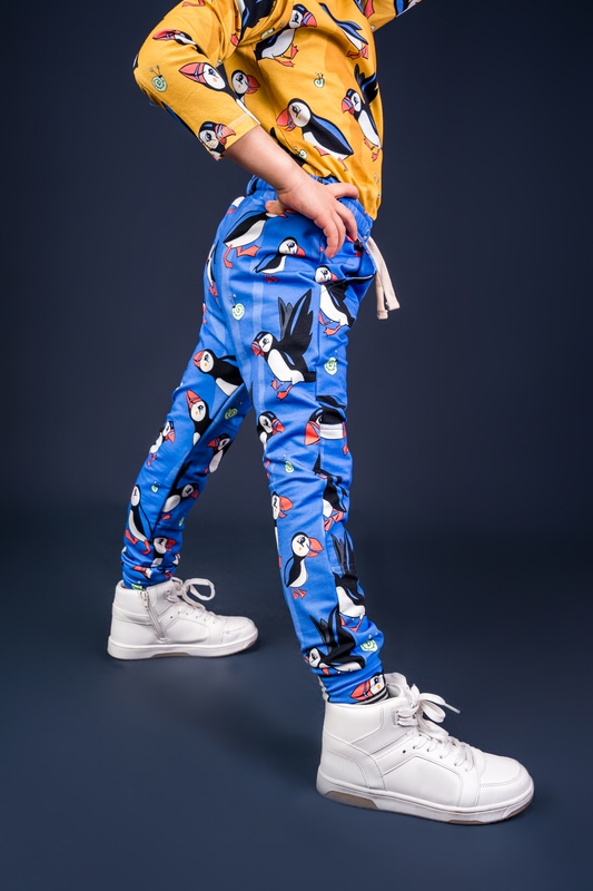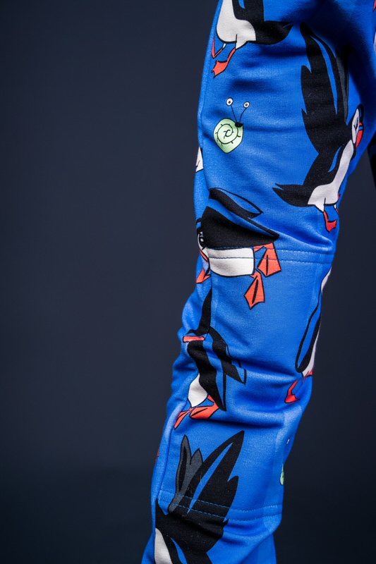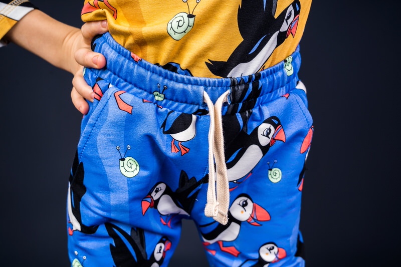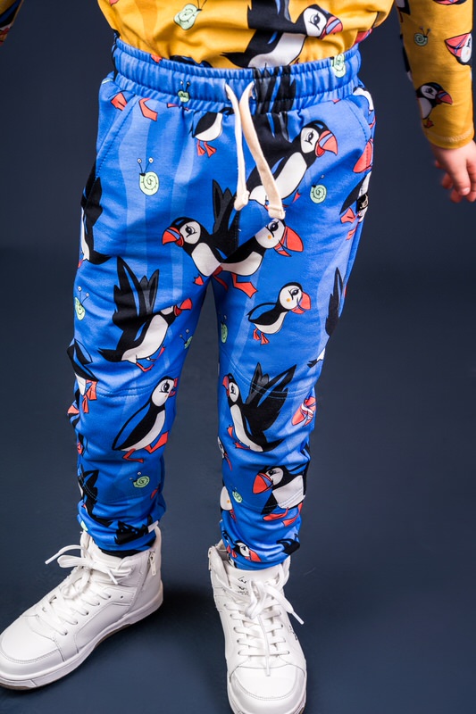 Beautiful blue draw string trousers with cute puffin print.