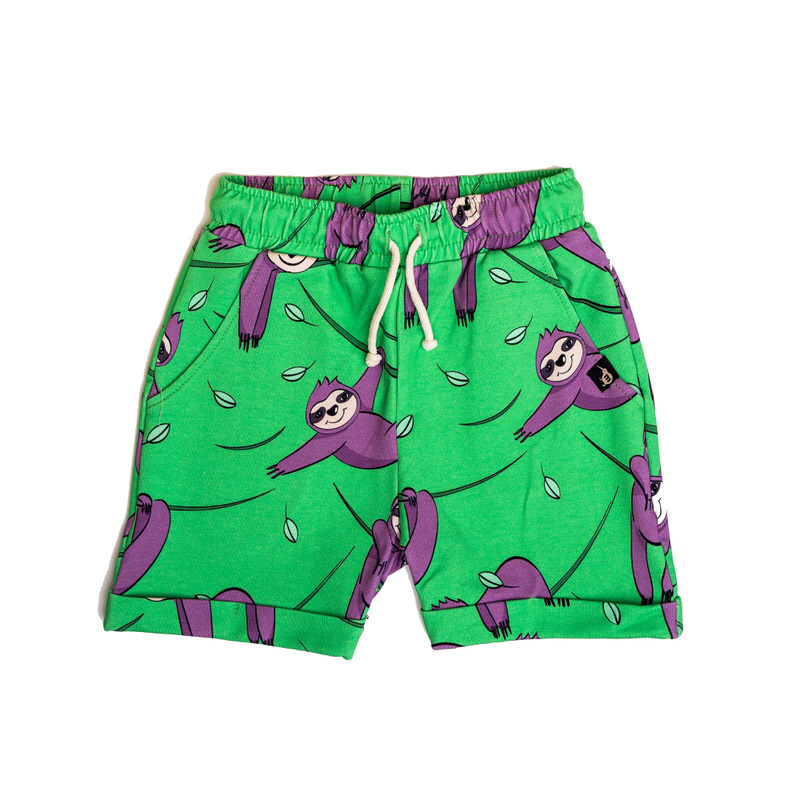 Cute green shorts with white drawstring at the elasticated waist and turn ups. The shorts have pockets. They feature purple sloths hanging around.