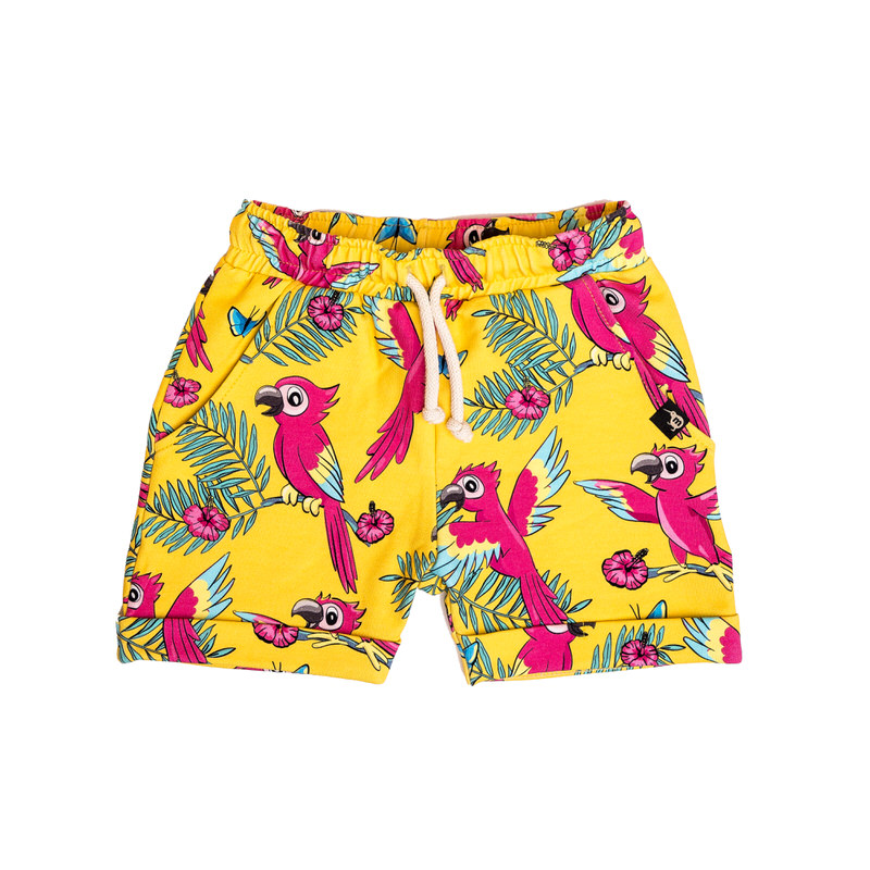 Cute yellow shorts with white drawstring at the elasticated waist and turn ups. The shorts have pockets. They feature pink, yellow and aqua parrots, green foliage, pink flowers and blue butterflies.