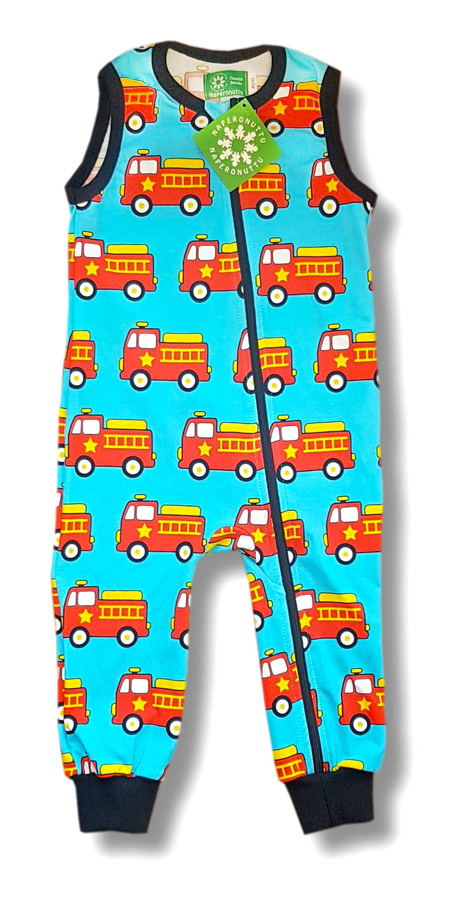 I just love this print! A gorgeous bright blue covered in bright red and yellow fire engines. A zip down the front makes this incredibly practical too.