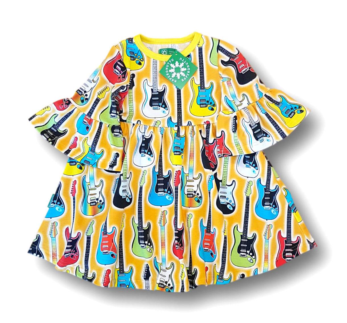 Gorgeous dress featuring a multicoloured guitar print. There is yellow edging at the neck and it has beautiful full sleeves.