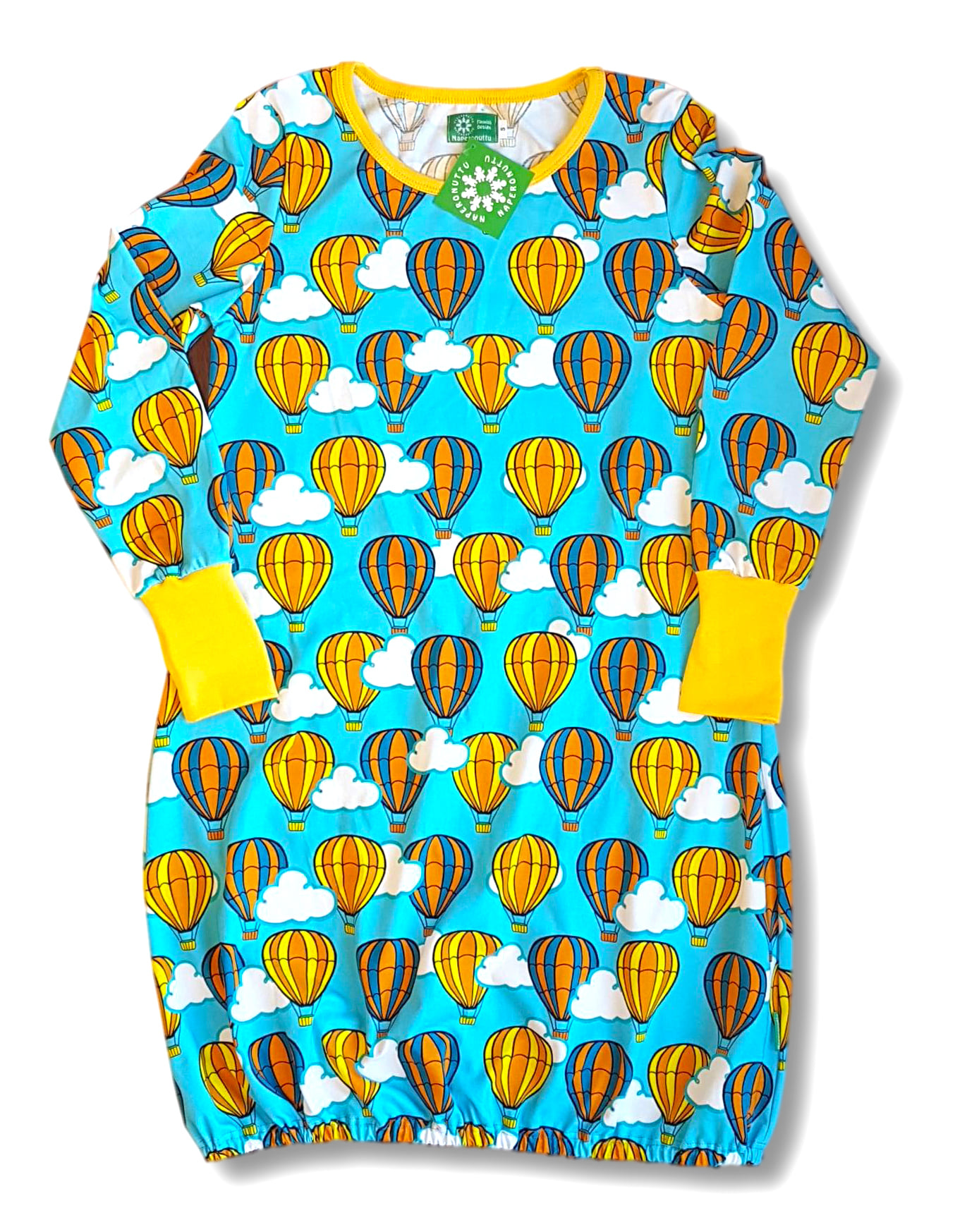 I just love this print! A gorgeous sky blue complete with white fluffy clouds is the perfect backdrop for blue, orange and yellow hot air balloons. Bright yellow ribbing at the neck and cuffs complete this beautiful dress.