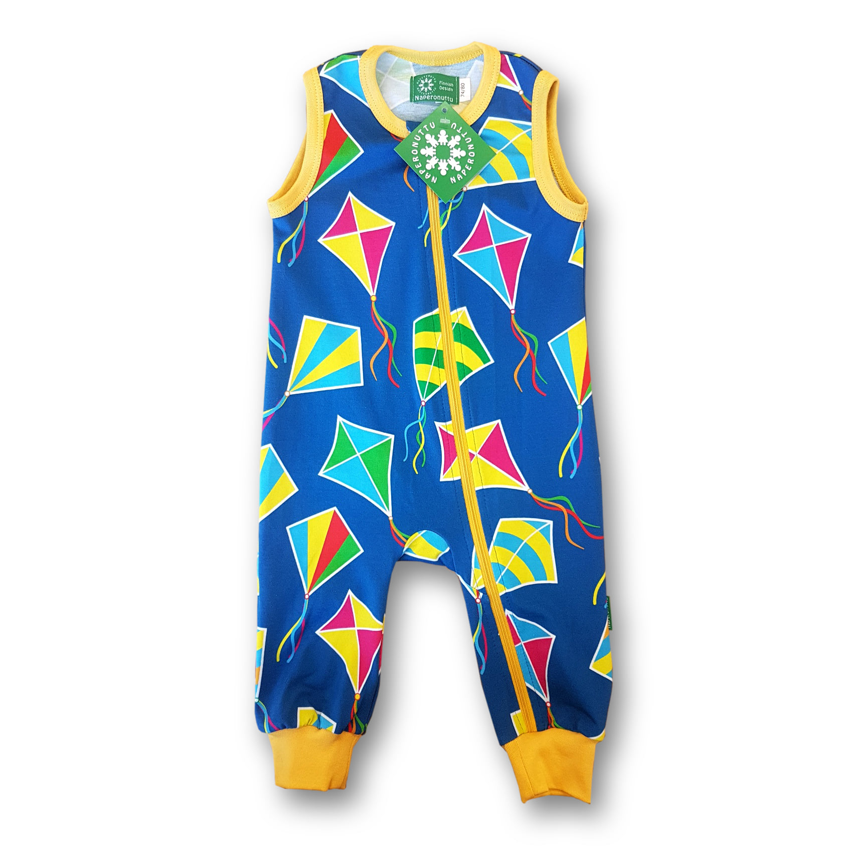 Gorgeous blue crawlers featuring a multicoloured kite print. There is yellow edging at the sleeves and neck, yellow cuffs at the ankles and a yellow zip.