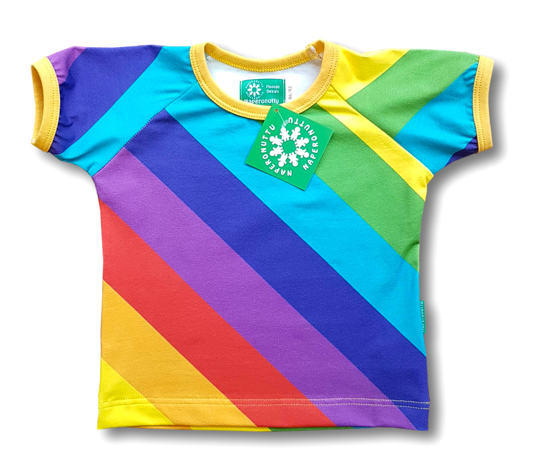 Who could fail to love this fabric? A gorgeous bright, rainbow striped fabric short sleeved top.