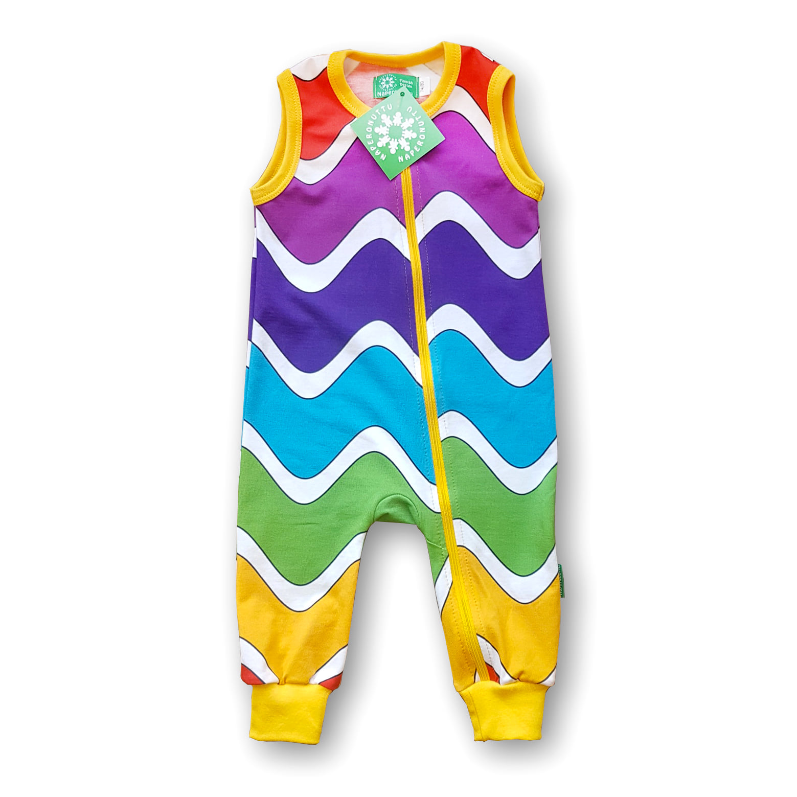 Gorgeous crawlers featuring a wavy rainbow print. There is yellow edging at the sleeves and neck, yellow cuffs at the ankles and a yellow zip.
