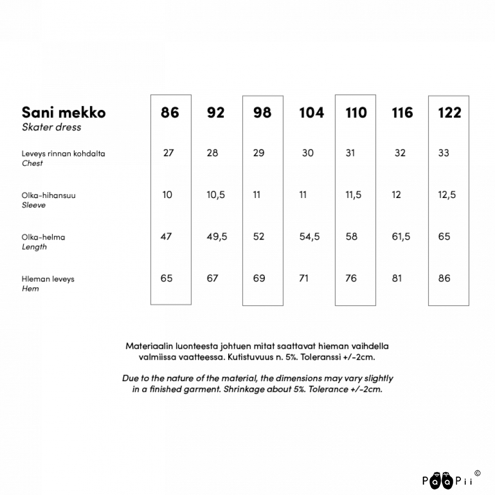 PaaPii is a Finnish design company, that sprung to life in 2011. Anniina Isokangas was filled with eagerness, inspiration and courage, as she turned her beloved hobby into a – then – small business. At first PaaPii produced small amounts of stuffed animals and interior products – and also fabrics, printed by hand. As the years passed, PaaPii moved to industrial production and brought clothing lines for babies, children and women for sale. Since 2017 all of our clothes have been made in our own sewing factory in Kokkola, Finland.