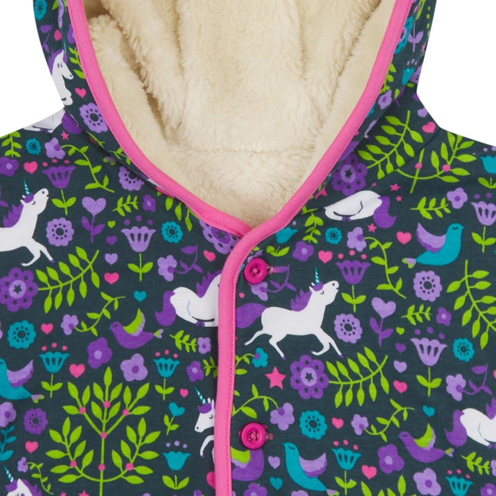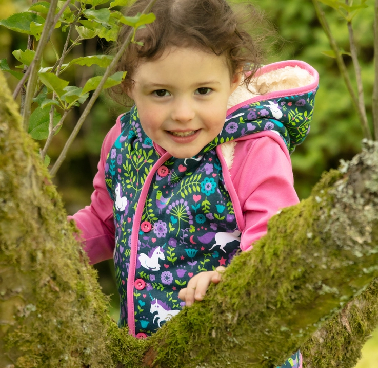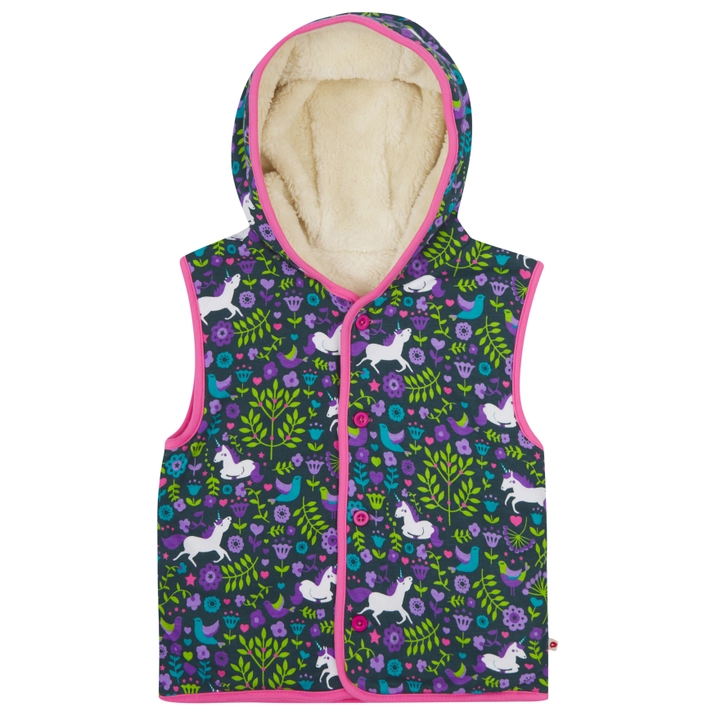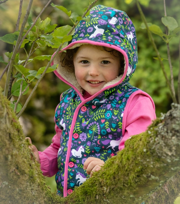 Sherpa fleece lined body warmer for girls with an integrated hood. It features a lovely unicorn print on a slate grey base. Our gilet is designed to be the perfect in between season outerwear. When you don’t quite need a coat, but a jumper is not quite enough. It provides all the warmth that is needed as the weather begins to cool. It makes a great all-year round staple item in your little ones wardrobe. Made from two layers of 100% organic cotton. The outer is made from jersey and the inner from sherpa fleece.