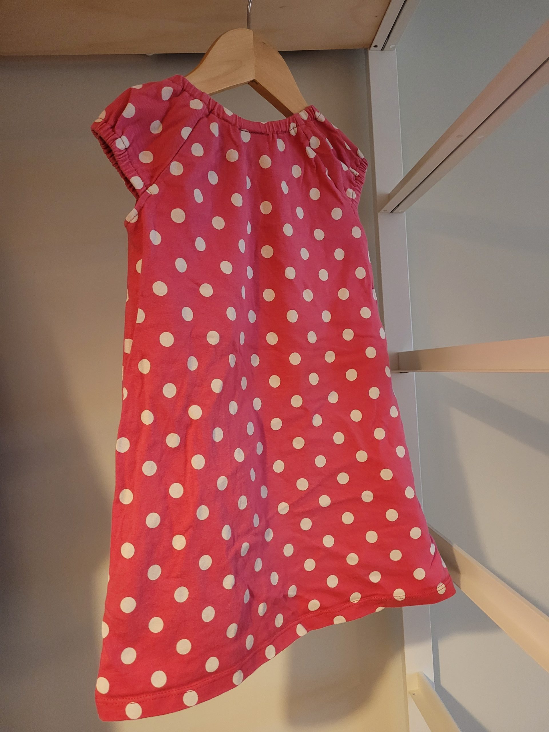 Gorgeous pink dress with white polka dots and applique sausage dog.  Elasticated at the neck and arms so super easy for independent little ones to start dressing themselves in!  Size 18-24 months.