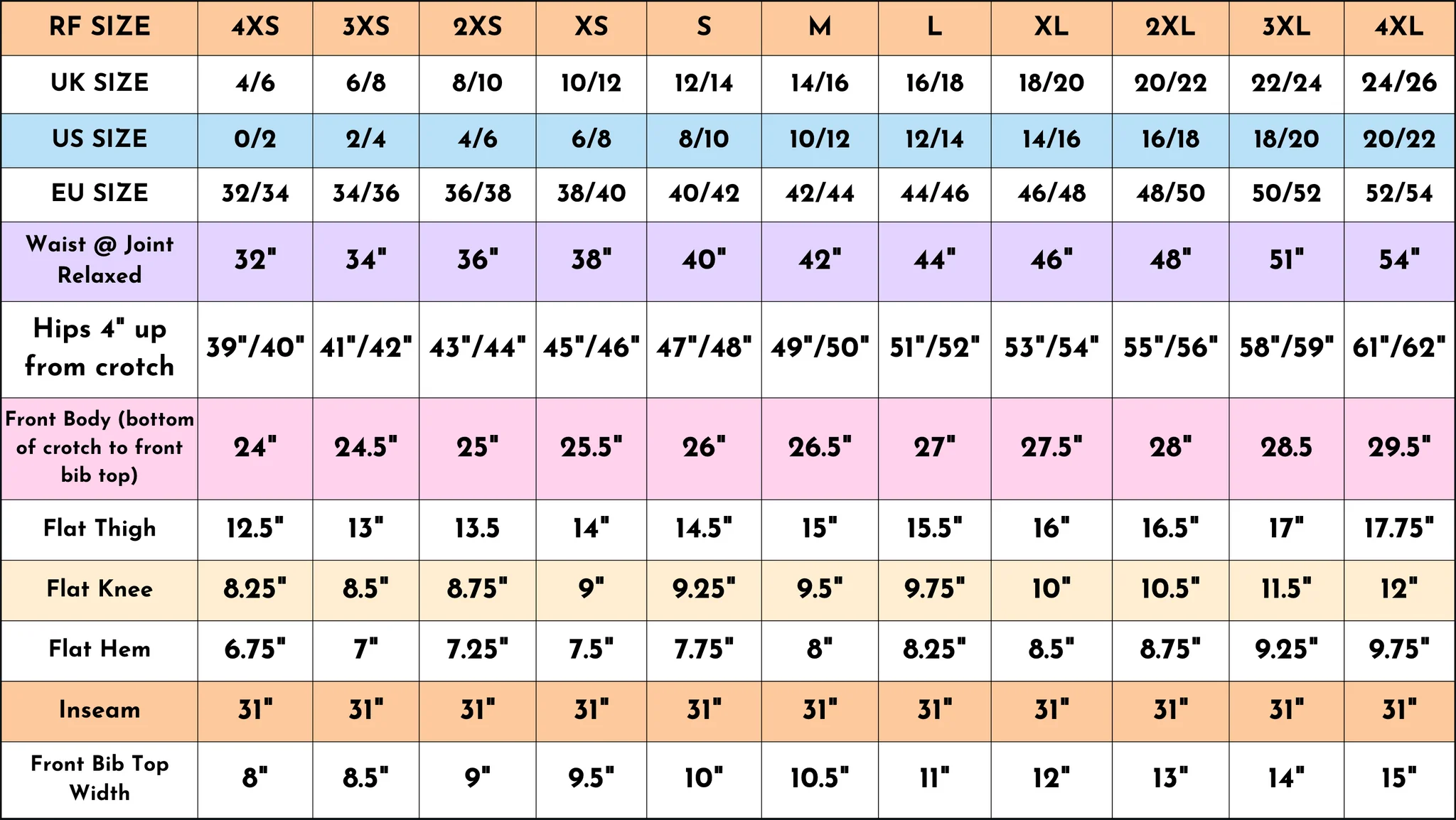 Size chart measurements are in inches of the garment, not the body they will fit. We suggest UK/US/EU sizing to help you in making a decision but please check the measurements for your best fit. We highly recommend laying your favourite fit of clothing flat and comparing its key measurements to the chart for the best fit.
