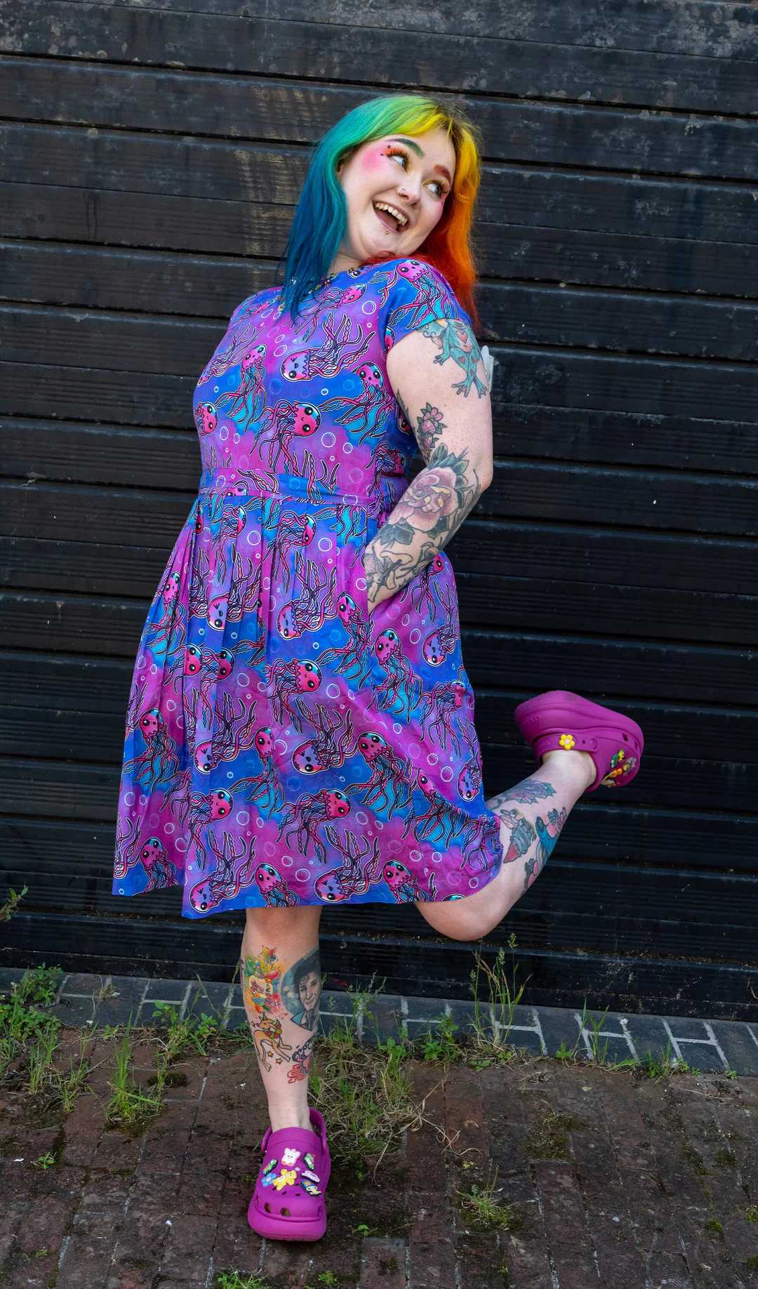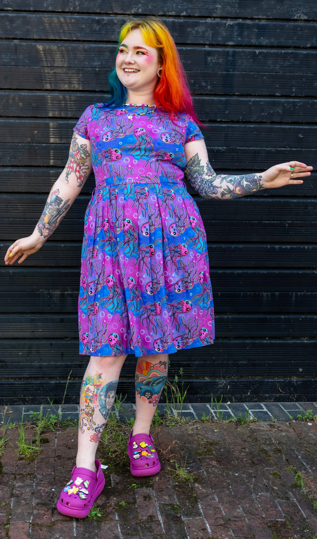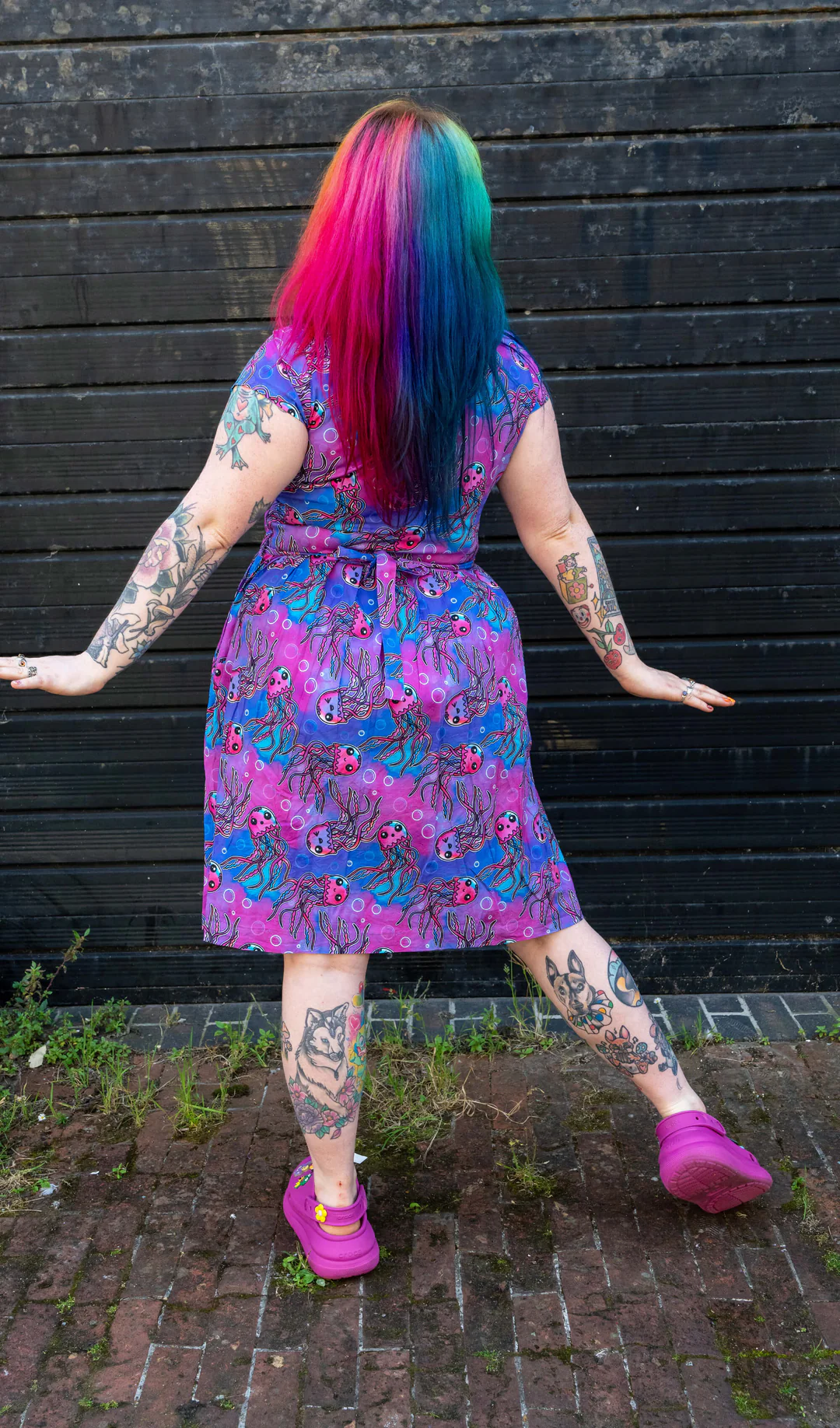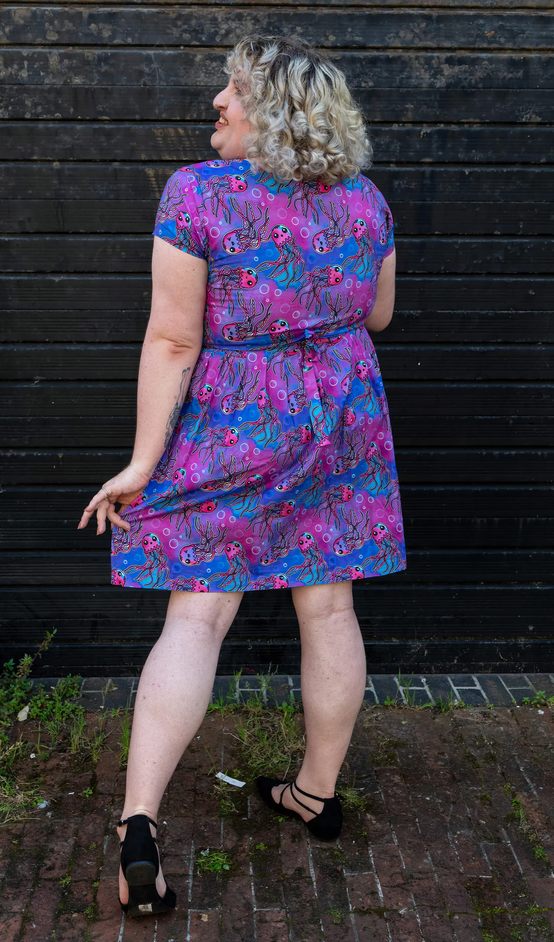 Jazz up your wardrobe with this Jellyfish Stretch Belted Tea Dress! The unique jellyfish print adds a playful touch to this classic tea dress. And with pockets and a stretchy material, it’s as practical as it is stylish. Say goodbye to boring dresses and hello to this quirky gem!